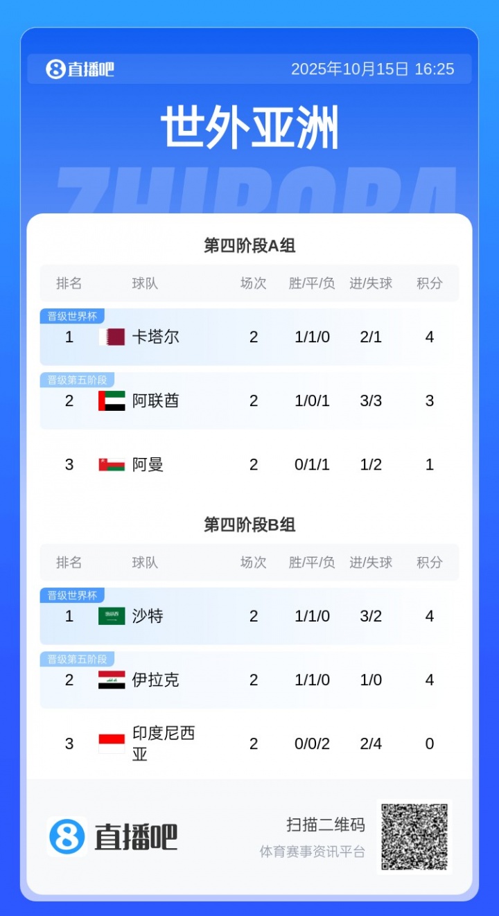 直播吧10月15日讯世预赛亚洲区第四阶段结束,该阶段的两个主办国家卡塔尔和沙特均顺利晋级,两队主场作战加之能比其他球队多休息3天的安排,遭到了其余国家的集体炮轰。