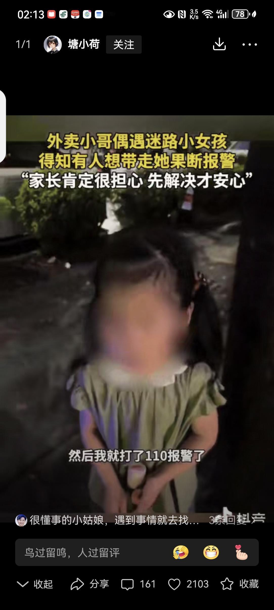 “这个小女孩太聪明了!” 近日,广东,外卖员高先生刚取完餐,一个小女孩拉住了他的衣服。高先生疑惑的低下头,看到一个梳着两个辫子,大约4、5岁的小女孩。 小女孩眼里含着泪,却说得清楚:“叔叔,我迷路了,有人要带我走,我没跟他走。” 高先生摸出手机看了眼订单,超时提醒已经在闪。但他没犹豫,当即拨通了110。 他蹲下来陪小女孩聊天,问她喜欢吃什么,还指远处的树转移她注意力。直到警车赶来,亲手把孩子交给出警民警,才转身去送餐。 这孩子是真机灵!不跟陌生人走,还专找穿工作服的外卖员求助。就像民警说的,找眼熟的从业者求助,是很聪明的自救方式。 其实外卖小哥早成了“民间守护者”:有人救过煤气中毒的店员,有人挡在被欺负的女孩身前。他们天天穿梭街巷,藏着最暖的善意。 所以下次餐送晚了,不妨多等几分钟。或许他们不是在路上,而是在帮像小女孩这样的人渡劫。