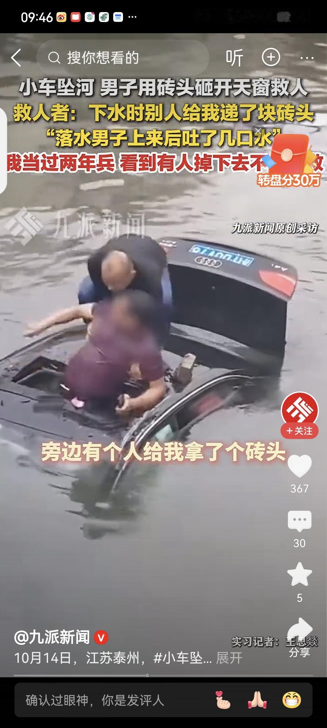 退役军人丢下2岁儿子跳河救人 泰州河边这一幕太揪心!奥迪车刚冲下河,岸边人群就炸开了锅,有人盯着水面喊“车里还有人”。 40岁的狄双成正好开车路过,副驾坐着老婆,后座是两岁的儿子。他没多犹豫,让家人在路边等着,自己抄起块石头就往河边冲。 作为退役军人,他知道落水车辆的凶险,水压早把车门封死了。他纵身跳进河里,先爬上车顶,举着石头猛砸天窗。 砸到第三下,石头没拿稳沉了底。他深吸一口气钻下去捞,上来接着砸,第四下终于把天窗砸开个口子。 这时候岸边扔下来救生圈,一名看着像民警的男子也跳下水。两人合力把被困司机从天窗拉出来,套上救生圈往岸边拽。 等把人送上救护车,狄双成才感觉手臂火辣辣地疼,低头一看全是血,玻璃碎片划了好几道口子。 “这点伤算啥,救人命才是大事。”他去医院包扎时轻描淡写地说,之前干代驾时救过路人,就算被讹过也没改这脾气。 目击者拍的视频传到网上,网友都喊他“泰州砸窗侠”,24小时播放量就破了3亿。当地要给慰问金,还被他婉拒了。 第二天他带着包扎的手臂去上班,同事递来个应急包。他笑着说:“以后车上除了孩子奶粉,得再备个破窗器。”