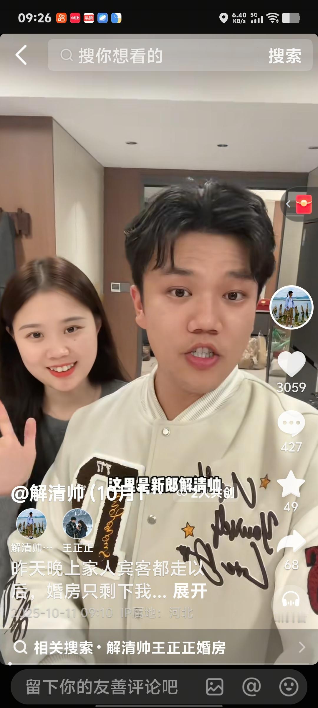 泪目!解清帅和王正正婚前激动落泪,帅帅当场发誓这辈子只对她好,解清帅婚礼定档10月12日,邀网友沾喜气! 解清帅发视频了。客人们都走了。他和王正正坐在客厅里。紧张的有些发抖。 他说以前总觉得结婚是很遥远的事情。现在和正正一起挑婚纱,和爸妈一起商量结婚细节。 现在觉得幸福这么具体正常说自己。很紧张,就怕做不好好妻子和好儿媳。 眼圈儿说着说着就红了。帅帅赶紧给他擦泪,说你也太感性了。要坚强,这是大喜事。 两个人坐在一起畅想美好的婚姻生活,回顾一起走过来的路。正正又流泪了,帅帅也红了,眼圈儿。 帅帅郑重的举手发誓这辈子永远会对正正好,然后感谢父母。为自己准备了房和车,没有后顾之忧。 感谢大哥,大嫂还有妹妹们,一直在为自己的婚礼忙忙碌碌。也感谢屏幕前的网友。 10月12号婚礼直播,邀请大家观看。一起沾喜气。分喜糖。 这两个孩子一路走来确实不容易。他们从校园到婚纱,当年帅帅一穷二白。正正选择和他谈恋爱。 以后两个孩子一起工作,打算白手起家,这时候帅帅认回了亲生父母。 接着又开始创业直播带货。事业做的风生水起。整个家庭都很幸福。两个孩子在一起也让我们看到了真正的爱情。 祝帅帅和正正新婚快乐,早生贵子!