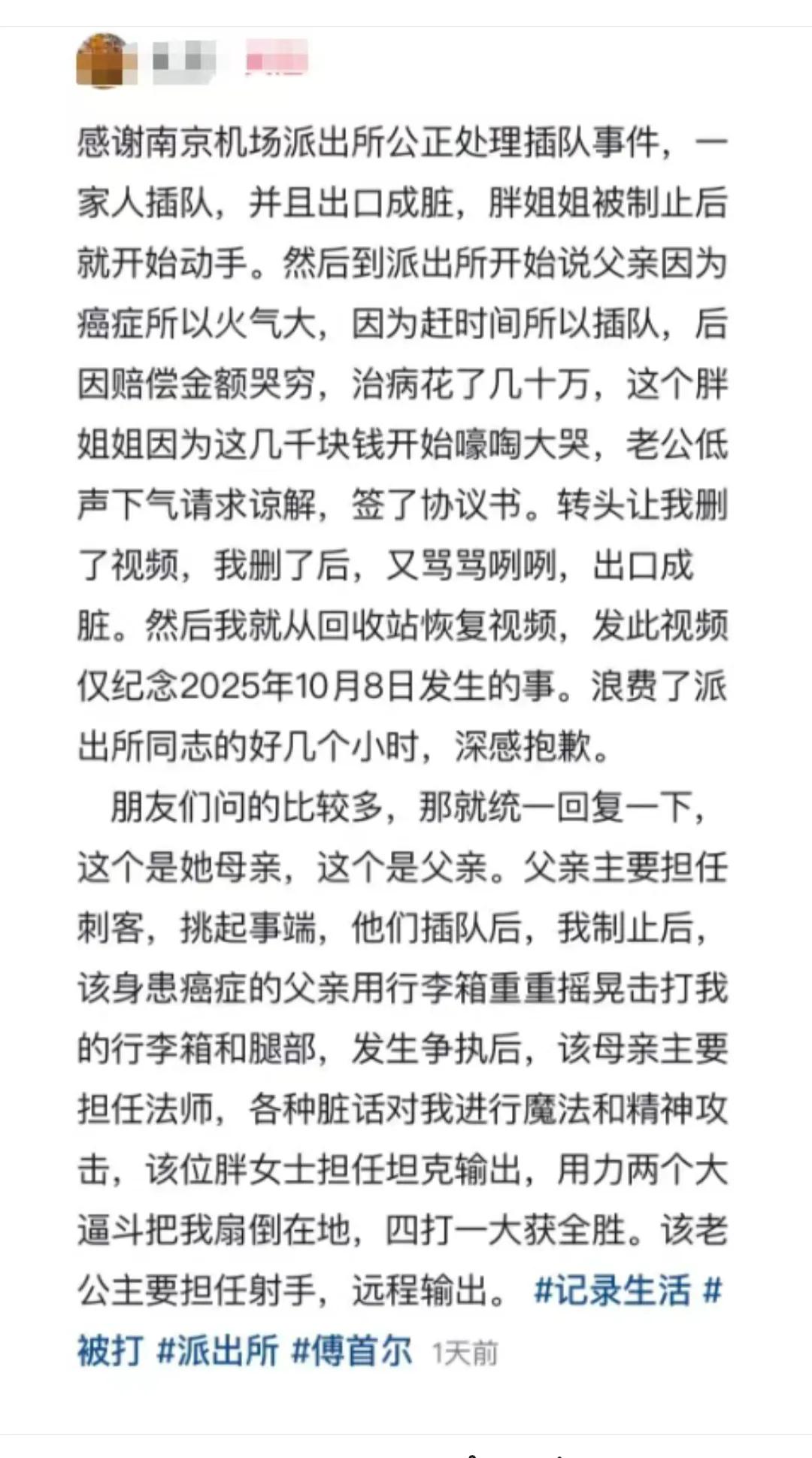 这对夫妻火了!江苏南京,夫妻机场插队,男子好心提醒,竟遭女子一记耳光。事后男子报警,夫妻俩竟一改常态,低声下气,表示求放过!男子心软放过后,夫妻俩又上演“川剧变脸,对男子骂骂咧咧起来。男子气不过,为了让全网看清他们的真面目,果断将其曝光! 其实插队的不仅仅是夫妻俩,准确的说是一家四口!里面有四个主要角色,一个是女子也就是男子口中的胖姐姐,这个是“主谋”,也是扇男子耳光的人。 一个是胖姐姐的父亲这个是事件的“始作俑者”男子好心提醒不能插队,她的父亲就开始用行李箱击打男子行李箱和腿部,男子才开始反击的。还有一个则是女子母亲,各种输出脏话,很是难听。而还有一个则是女子老公,在远程负责火力掩护。一家人也是对着男子推搡辱骂了十多分钟才肯罢休。 后面男子报警 ,这时夫妻俩开始上演“川剧变脸”,先是哭着喊着求男子放过他 称是因为父亲有癌症才这么着急赶飞机的,男的也像变了个人似的, 求男子放过夫妻俩一马,开个谅解书 赔个几千块钱就行了。 男子也是心软了,放了他们一马,也删掉了上传网上的视频,结果呢 ,夫妻俩又开始对着男子骂骂咧咧。 最后男子实在是气不过  ,想让全网见识这夫妻俩的嘴脸  ,又重新把视频发在了网上。 而夫妻俩共赔给4030元,其中里面有530是支付男子改乘高铁的费用。 对此有的网友表示:坚决不和解,发生这个事情既然耽误我行程了,咱就不差这个钱,一定要让他进去。 有的网友说:这种势利小人暂时的妥协、求和、低声下气,只是出于害怕,不是真心悔过,你把证据删了,他们瞬间就觉得自己又行了,不过好在你聪明,留一手,从回收站里恢复过来。 我觉得有事好好说,这种情况好好沟通大家伙,还是会体谅你的,非要动粗,那就不要怪男子不客气了。 根据《治安管理处罚法》第四十三条规定,殴打他人的,或者故意伤害他人身体的,处五日以上十日以下拘留,并处二百元以上五百元以下罚款;有结伙殴打、伤害他人的,多次殴打、伤害他人或者一次殴打、伤害多人等情形之一的,处十日以上十五日以下拘留,并处五百元以上一千元以下罚款。 对此你们怎么看呢?欢迎留言讨论!