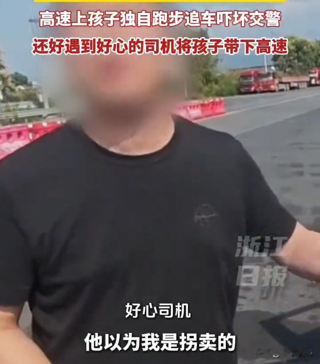 杭新景高速上,一男孩在车道上跑步。交警吓坏了,忙出手带走男孩,问:为什么在高速上