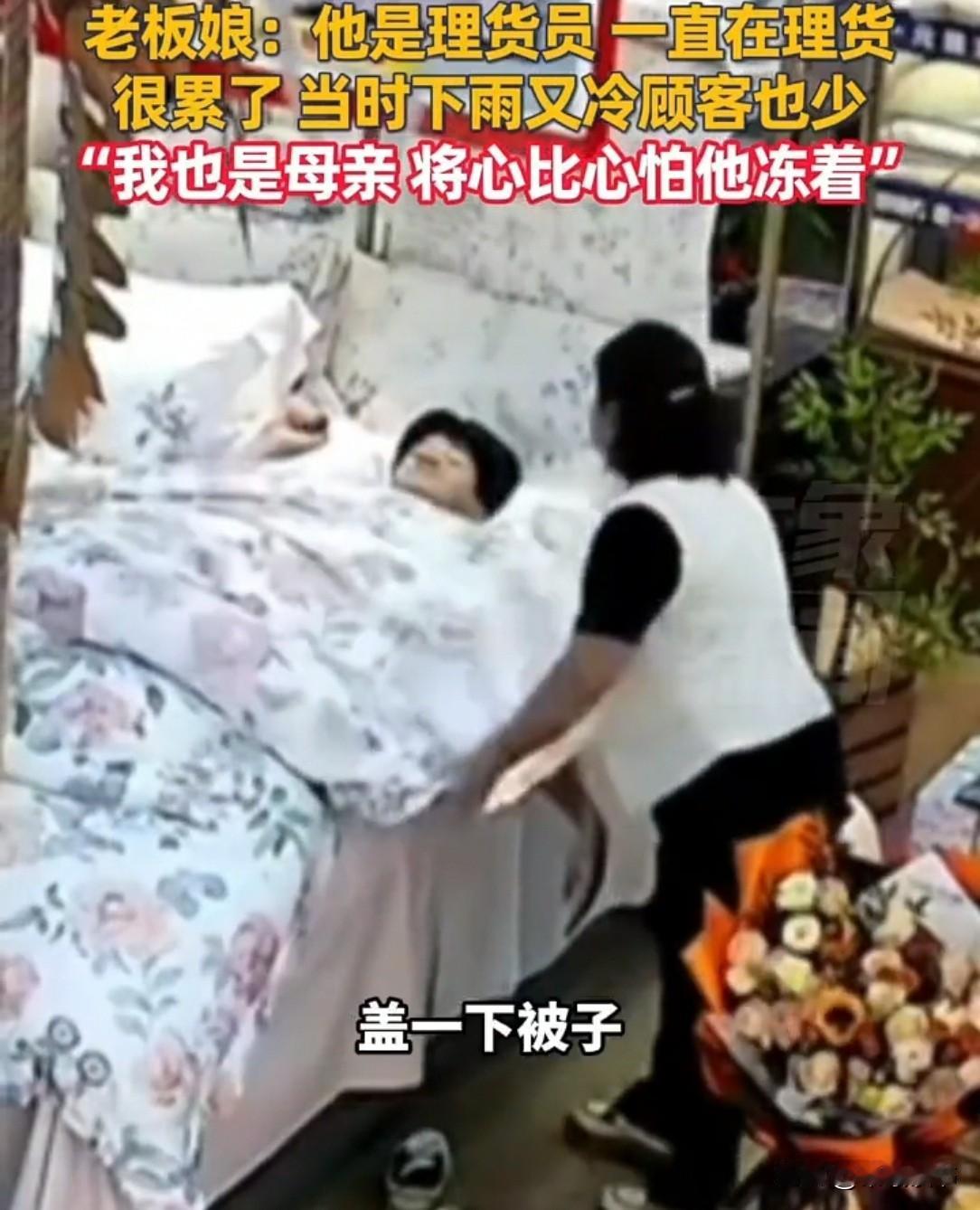 河南郑州一家纺店,00后员工理完货累得在展示床上睡着了。老板娘走过来,旁边员工以为要挨骂,谁知,老板娘看着熟睡的员工,轻轻笑了笑。 9月20日清晨,00后员工怀着激动的心情来到了郑州的一家家纺店。 今天是他第一天上班,一路上,他满脑子都是一会儿要如何好好变现。 很快,店门打开了,00后员工开始跟着老员工熟流程。 叠被罩时手指被棉线勾到,他悄悄把倒刺掐掉;搬床垫时后腰隐隐发酸,他咬着牙挺直背,只想着“多干点,早点上手”。 一上午,他的身影在货架与仓库间不停穿梭,额角的汗顺着脸颊往下淌,浸湿了T恤领口也顾不上擦。 直到下午快5点时,,店里顾客渐渐少了,他才后知后觉地感到眼皮发沉,腿像灌了铅似的。 “就眯两分钟,马上起来理货”,他心里默念着,轻轻躺在靠窗的展示床上,头刚沾到柔软的枕头,疲惫就席卷而来,很快便睡了过去。 “哎,你看新来的那小伙子……”理货区的王姐用胳膊肘碰了碰旁边的同事,眼神示意着展示床的方向,声音压得很低,“这要是被老板娘看见,不得挨说啊?” 另一个同事也皱着眉点头:“刚上班就偷懒,老板娘最看重勤快了。”两人正小声议论着,就见老板娘径直朝着展示床的方向去。 王姐和同事瞬间屏住呼吸,下意识地想上前打圆场,却见老板娘脚步忽然放轻,原本略带匆忙的神色也放缓了。 老板娘起初以为是顾客在试躺,走近了才看清是那位新来的00后员工。 见对方眉头还微微皱着,嘴角却带着点放松的弧度,想来是累坏了。 她回头冲王姐两人轻轻摇了摇头,示意她们别出声,然后转身轻手轻脚地走到库房,抱来一床浅灰色的薄被。 她蹲下身,小心翼翼地把被子展开,先盖住对方的肩膀,再慢慢拉到他的脚踝,生怕动作重了吵醒他。 盖好被子后,她又站在旁边看了几秒,看着男孩眉头渐渐舒展开,忍不住轻轻笑了笑,眼里满是柔和。 后来接受采访时,老板娘提起这事,语气很自然:“我看着他一上午没停过,汗都没顾上擦。那天还下雨,店里空调又凉,我也是当妈的,看着孩子累成这样,哪忍心说他? 将心比心,谁还没个累的时候呢,让他多睡会儿,缓过来了才有力气干活。” 老板娘这举动,暖到人心坎里了!都说“人心换人心,四两换半斤”,员工卖力干活,老板体谅辛苦,不骂反盖被,这样的店,谁不愿好好干?