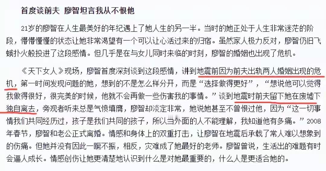 无腿舞者廖智40岁怀4胎!大女儿在08年地震丧生,离婚后遇到真爱 刷到无腿舞者廖智官宣怀四胎的消息时,我忍不住红了眼眶——这个在17年前汶川地震里失去一切的姑娘,终于把破碎的人生,拼出了最暖的模样。如今40岁的她,不仅再婚找到了把她宠成宝的真爱,肚子里还揣着新生命,可很少有人知道,这个“四胎”背后,藏着她一辈子都忘不了的痛:2008年那场灾难,她才10个月大的大女儿虫虫,永远留在了废墟里。 还记得2008年5月12日那天吗?全国人的心都跟着汶川的震颤揪成一团。当时23岁的廖智,还是四川绵竹一个普通的舞蹈老师,日子过得像裹了糖的棉花——白天带着孩子们在舞蹈室转圈,晚上回家有婆婆帮忙照看女儿虫虫,丈夫虽然不算完美,但一家四口的热闹,足够让她觉得踏实。可谁能想到,灾难和背叛会同时砸向她。 地震前没多久,廖智发现丈夫在她孕期出轨了,她想着等虫虫再大些好好谈,没承想,地震来得比她的“计划”快得多。26个小时,她被埋在漆黑的废墟里,腿被预制板压得失去知觉,耳边是不断的坍塌声,心里只有一个念头:“我的虫虫呢?”等救援人员把她挖出来时,她才知道,女儿和婆婆都没了,而那个出轨的丈夫,早在地震发生时就独自跑了,连回头找她的念头都没有。更残忍的是,因为腿被压太久严重感染,医生告诉她:“想活命,必须截肢。” 对一个舞者来说,双腿就是命啊。可廖智没垮,她躺在病床上,摸着空荡荡的裤管,反而笑了:“没了腿,我还有手,还有心,照样能跳舞。”2008年9月,距离截肢手术才三个多月,伤口还在隐隐作痛,她戴着临时假肢,站上了世界小姐重庆赛区的舞台。鼓面就放在她的残肢上,随着鼓点落下,她的身体一次次扬起、落下,每一个动作都像在跟命运较劲,台下的观众哭成一片,而她眼里的光,比聚光灯还亮。这支《鼓舞》,让所有人记住了“廖智”这个名字——那个没了腿,却把舞跳得比谁都有力量的姑娘。 后来她又站上《舞出我人生》的舞台,戴着定制假肢旋转、跳跃,一路闯到总决赛拿了亚军。有人问她累不累,她笑着说:“比起在废墟里等死,现在每一秒都在赚啊。”也正是这份乐观,让她遇见了这辈子的“专属工程师”王启凡。这个在美国留过学的台湾学霸,2008年就因地震参与过假肢研发,后来干脆专门研究假肢。第一次见廖智时,他压根没认出来——眼前的姑娘笑着聊天,取下假肢检查时干脆利落,一点不像经历过灭顶之灾的人。 王启凡动了心,翻遍了所有关于廖智的报道;而廖智也没因为上段婚姻封闭自己,她说:“喜欢就主动,过日子本来就是两个人凑一起取暖。”婚后11年,王启凡把“专属”二字做到了极致:廖智想穿裙子,他就做轻便的假肢;想跳舞,就调得更有弹性;甚至还做了“高跟鞋款”,让她穿裙子时更漂亮。如今两人已经有了一儿一女,今年6月廖智抱着肚子录视频官宣怀四胎时,脸上的幸福藏都藏不住。 今年5月,她还在视频里念叨:“要是虫虫还在,今年该18岁了。”我想,虫虫一定在天上看着妈妈,看着她从废墟里爬起来,看着她重新跳舞,看着她有了新的家人。17年前,命运把她的人生砸得粉碎;17年后,她用自己的韧劲,把碎片一片片捡起来,拼成了更温暖的模样。 有人说廖智是“幸运”,可我觉得,她的幸运是自己挣来的——在绝望里不放弃,在苦难里不低头,这样的姑娘,就该被生活好好善待。希望她和宝宝都平平安安,也希望这个爱笑的舞者,往后的日子里,每天都能笑得眉眼弯弯,把剩下的甜,都尝个遍。