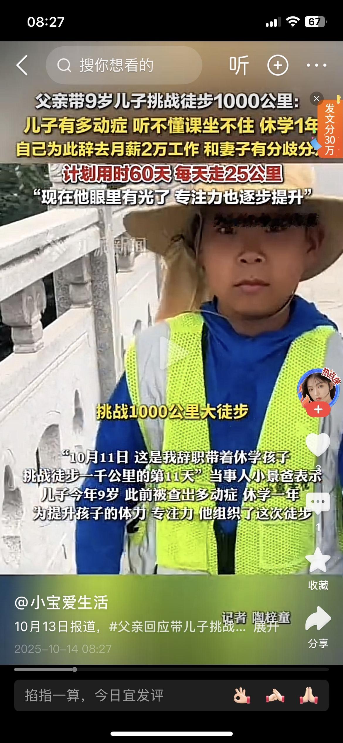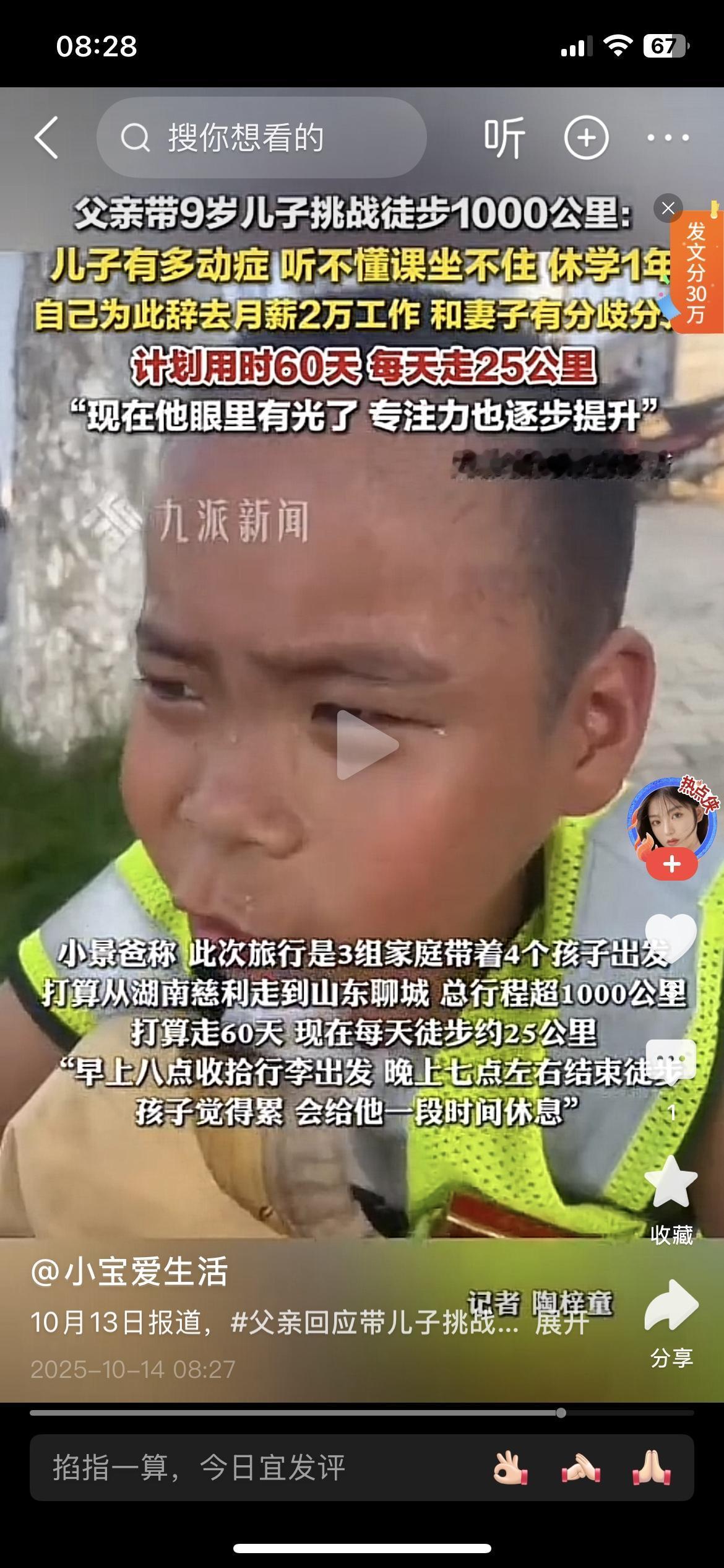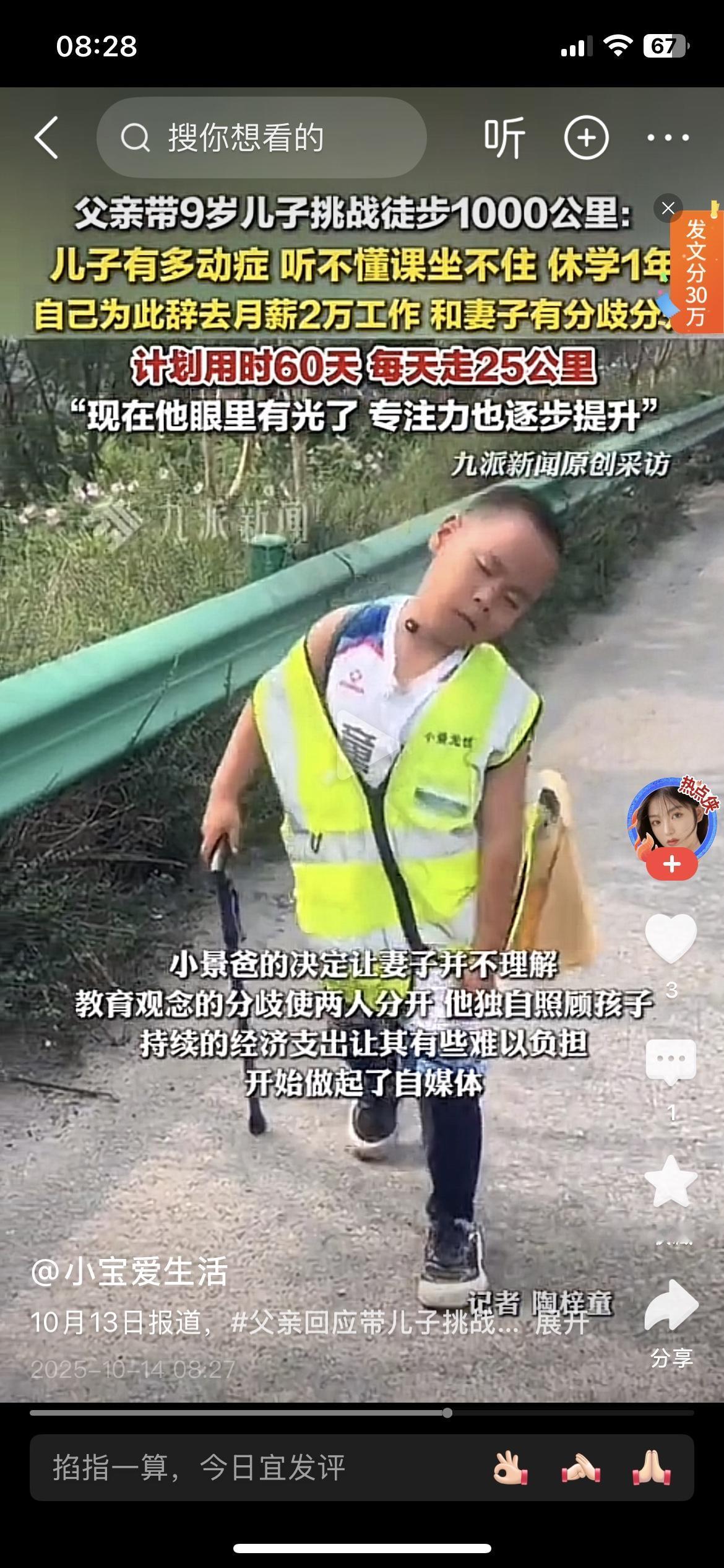 父亲辞职带多动症儿子徒步千里:60天从湖南到山东,用脚步练专注力 2025年10月13日,一则“父亲带儿子挑战1000公里徒步”的消息引发关注。这位父亲近日回应称,儿子患有多动症,为提升其专注力,他毅然辞职,计划用60天时间,带儿子从湖南慈利徒步前往山东聊城,全程约1000公里。 据了解,这趟徒步并非一时兴起。父亲表示,此前尝试过多种方式帮助儿子改善专注力,但效果有限,偶然间想到通过长距离徒步的方式,让孩子在坚持中学会专注与毅力。目前,父子俩已开启徒步旅程,沿途会记录行程点滴,不少网友看到后纷纷点赞,称这是“最有意义的亲子教育”,也有部分网友担心孩子体力能否支撑,父亲回应会根据儿子状态调整节奏,安全始终放在第一位。 这趟跨越两省的徒步,不仅是一次身体的挑战,更是一场特殊的亲子成长课。网友们期待看到父子俩顺利抵达终点,也希望孩子能在这段旅程中有所收获。