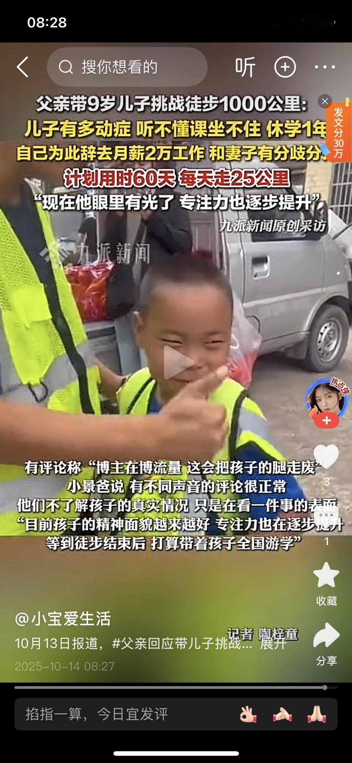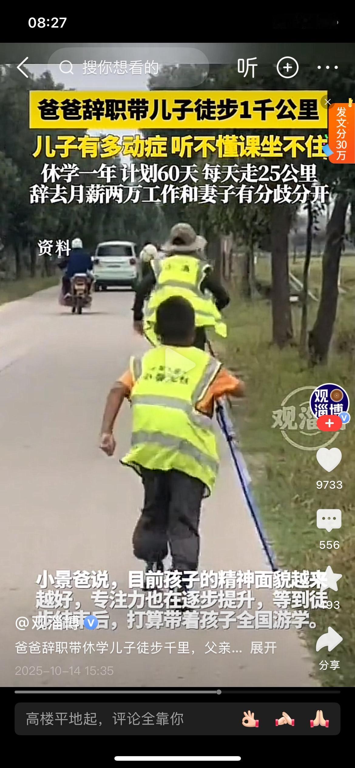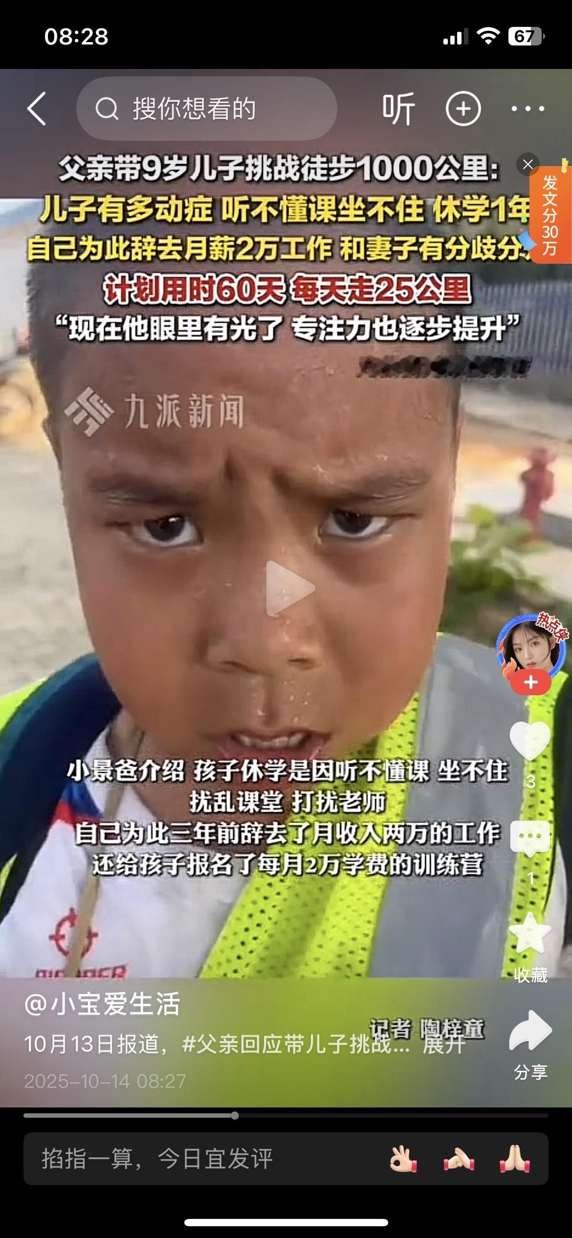 父亲辞职带多动症儿子徒步千里:60天从湖南到山东,用脚步练专注力 2025年10月13日,一则“父亲带儿子挑战1000公里徒步”的消息引发关注。这位父亲近日回应称,儿子患有多动症,为提升其专注力,他毅然辞职,计划用60天时间,带儿子从湖南慈利徒步前往山东聊城,全程约1000公里。 据了解,这趟徒步并非一时兴起。父亲表示,此前尝试过多种方式帮助儿子改善专注力,但效果有限,偶然间想到通过长距离徒步的方式,让孩子在坚持中学会专注与毅力。目前,父子俩已开启徒步旅程,沿途会记录行程点滴,不少网友看到后纷纷点赞,称这是“最有意义的亲子教育”,也有部分网友担心孩子体力能否支撑,父亲回应会根据儿子状态调整节奏,安全始终放在第一位。 这趟跨越两省的徒步,不仅是一次身体的挑战,更是一场特殊的亲子成长课。网友们期待看到父子俩顺利抵达终点,也希望孩子能在这段旅程中有所收获。