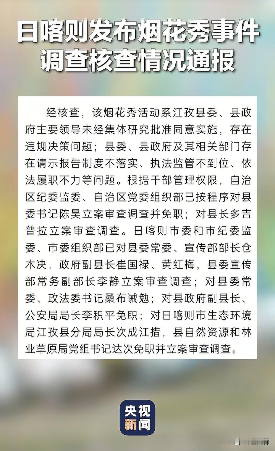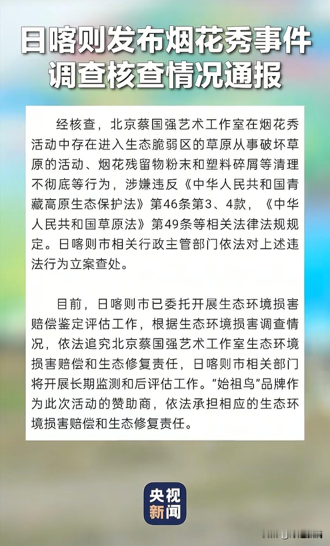 央视公布了“蔡国强烟花秀”事件调查核查情况,蔡国强这回算是搬起石头砸自己的脚了,损害赔偿和修复责任一个都跑不了了,“始祖鸟”品牌也要承担责任,事件相关的多人被免职,移交司法。 生态环境这条红线,谁都不能触碰,这次的处理,也是打了个样,让大家拍手称快,同时也起到了强有力的震慑作用。 (新闻来源:央视新闻)