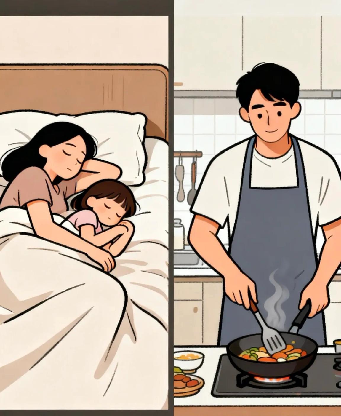 下午五点,暮色刚漫进客厅,丈夫下班归家。我和女儿在卧室酣睡,他推门进来时脚步轻得像猫,指尖触我手臂低唤“醒醒”,我仅懒懒翻个身,依旧沉在梦里。 他悄然去浴室冲澡,再默默洗净换下的内裤。回房时低声道:“我去备餐,儿子快放学了。”我听着却不愿应声,生怕一开口,这片刻的休憩便戛然而止。 不过十分钟,校车鸣笛由远及近,三十秒后儿子的脚步声已在玄关响起。丈夫及时拦在客厅:“别进卧室,妈和妹妹在睡觉,去客厅玩。”我了然一切,只是不愿睁眼。 挣扎片刻,念及他整日奔波,我终是起身。步入厨房,见他系着我那素色围裙,在氤氲的烟火气里切菜,余晖勾勒出他专注的侧影。他偶有疏忽,却总在细微处显担当。 人无完人,可这份在疲惫中仍顾全家庭的心意,已足够动人。你说,这样的伴侣,该得几分?