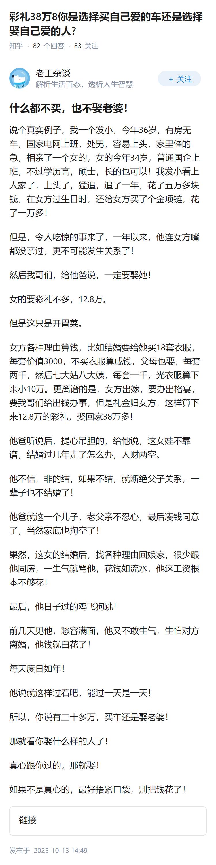 彩礼38万8你是选择买自己爱的车还是选择娶自己爱的人?