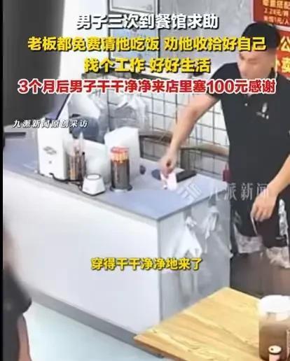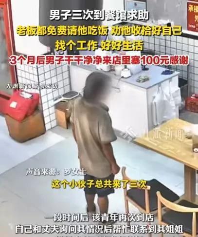 广东广州,一个穿着脏乱衣服的男子走进一家饭店,开口就让老板给他免费吃饭,老板善良,看他似乎精神不对劲,就给他免费吃饭,可他来了一次又一次,总共来了3次,老板都免费给他吃饭了,后来老板看不下去了,就劝他,好好收拾自己,找个班上,结果3个月之后,男子脱胎换骨了。 罗女士和丈夫经营着一家饭店,夫妻俩齐心协力,饭店生意红红火火的。 开饭店时间长了,罗女士和丈夫经常会帮助一些需要帮助的人。 这个小伙子是其中的一个,当时这个小伙子穿着很脏的衣服走进店里,他头发乱糟糟的,又是大热天,一进来就让人闻到一股味道。 当时罗女士和丈夫看到他进店,并没有把他赶出去,而是看他想干什么。 只见这个小伙子什么都不说,久久才说了一句,我没有钱吃饭。 罗女士的丈夫马上明白,这是一个落魄之人,估计是受到什么挫折了,所以才不收拾自己,又或者遇到什么事了,还想不明白。 他没有问,他知道小伙子肯定是肚子饿了,要不然不会开口说没钱想吃饭。 罗先生的丈夫看着小伙子,马上就打了一份饭菜给他,免费给他吃。 遇到这样的人,罗女士和丈夫是不会拒绝的,毕竟他们只是在肚子饿的时候要一份饭,并非是要钱。 如果是要钱,罗女士和丈夫或许还不会给,毕竟有手有脚的人,只要肯干活,不好吃懒做,怎么也能养活自己。而真正要一碗饭吃的人,才有可能是真正的遇到了困难。 当时罗女士和丈夫给这个小伙子吃了一份免费的饭菜之后,小伙子识趣地走了出去,夫妻俩也没有将这件事放在心上。 可没过多久,这个小伙子又来到了罗女士的饭店了,衣服还是那么脏乱,头发还是那么乱糟糟。 这一次,罗女士和丈夫关心这个小伙子了,就问他遇到了什么困难,小伙子支支吾吾,说不明白。 罗女士和丈夫问了半天,才联系到了他的姐姐,姐姐愿意帮他付饭钱。 小伙子两次进店,夫妻俩都感觉这小伙子不对劲,可能真的是遇到困难了,还是免费给他吃饭菜了。 而这个小伙子,还是没有改变自己,他过了一段时间又进到了罗女士的饭店,这一次他要一个米袋。 罗女士夫妇看到小伙子,依然还是那么脏脏的,还要一个米袋,显然小伙子已经意识到自己没钱吃饭是个大问题了,可能要米袋去拾废品来卖。 看着好好的一个小伙子,有手有脚的,虽然脸脏了些,但他们能看出小伙子还是很帅气的,只是脸上少了些阳光。 他们猜测,小伙子肯定是走投无路了,却又在迷茫中,不知该怎么改变自己的生活。 他们又帮小伙子联系了他的姐姐,姐姐心疼弟弟,又给他转来了380元,这些钱,罗女士都换成现金给了小伙子。 看着小伙子依然迷茫,不知所措,罗女士和丈夫便开始劝小伙子了。 他们跟小伙子说,只要好好收拾一下自己,找个班上,好好生活,就可以改变自己,他们苦口婆心,跟小伙子进行了一番劝说。 他们真希望小伙子能够走出迷茫,好好收拾一下自己,找份工作,养活自己。 小伙子若有所思地离开了,罗女士和丈夫也希望这个小伙子能够改变自己。 后来他们再也见不到这个小伙子了,他们还时常想着,小伙子到底有没有找到工作?还有没有饭吃? 时间一晃,过了三个月,罗女士和丈夫依然为自己的饭店忙碌着。 可没想到,10月13日这天,小伙子给他们带来了惊喜。 当时罗女士的丈夫正坐在收银台上休息,突然进来一个小伙子,在他的桌子上放了100块钱,转身就快速要离开。 罗女士的丈夫还没有反应过来,只看到小伙子要走出去了,他赶紧喊住对方。 等他看清楚小伙子的容貌,他们吃惊了,这个小伙子竟然就是那个穿着脏乱衣服的小伙子,三个月不见,小伙子脸色红润了不少,头发变清爽了,理了个帅气的发型,衣服也是干干净净的。 和三个月之前的小伙子相比,他真的是脱胎换骨了,完全变了一个人,变得阳光帅气了,整个人都自信了。 小伙子被罗女士丈夫追出来,他不好意思地笑了,罗女士的丈夫也不愿意收这100块钱,毕竟当初他就是想帮助小伙子。 但小伙子因为罗女士夫妇的善良,点亮了他世界的光,这100块钱是他的感恩之情。 罗女士夫妇和这个小伙子之间的故事,真的很令人感动,罗女士夫妇相信善良能够帮助他人,小伙子相信这世界上有光,滴水之恩,涌泉相报,小伙子懂! 那么如何看待罗女士夫妇的善良行为呢? 对于罗女士夫妇来说,他们在小伙子困难时,免费给这个小伙子提供饭菜,这是道义上的赠与行为,是不需要回报的。 《民法典》第658条规定:赠与人在赠与财产的权利转移之前可以撤销赠与,但经过公证的赠与合同或者依法不得撤销的具有救灾、扶贫、助残等公益、道德义务性质的赠与合同除外。 不过小伙子知恩图报,愿意在困难解决之时,用100元回报他们的善良行为,让人看到这个世界的美好。 那么你对罗女士夫妇和小伙子之间的故事,有何看法呢?#头号创作者激励计划#