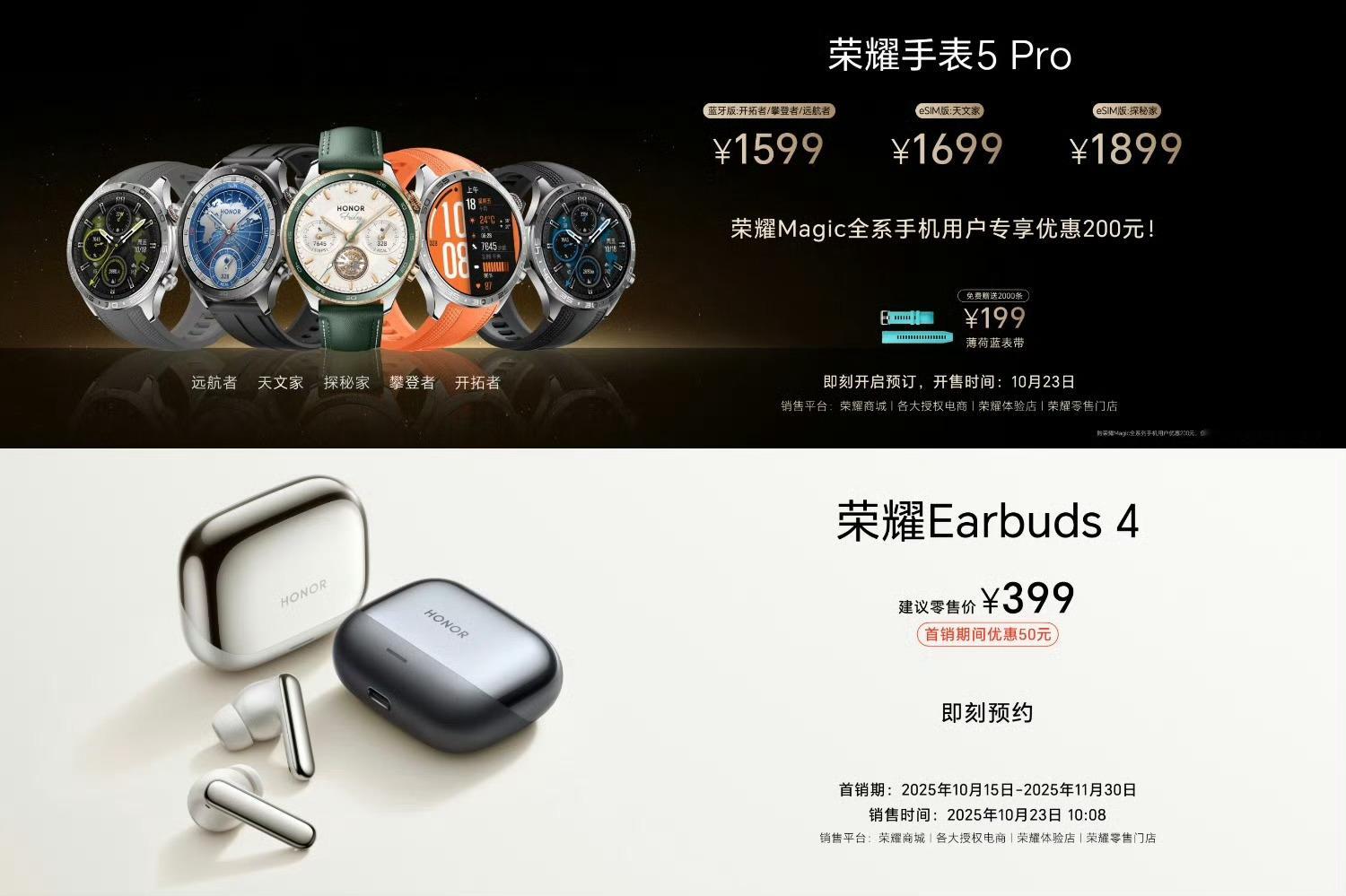 荣耀Watch5Pro,升级无感血压测量,1599起(荣耀用户再-200)。