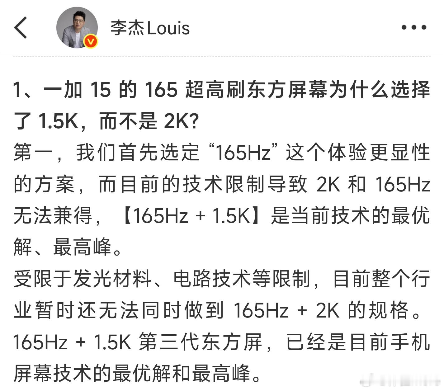 一加李杰称,一加15用1.5K屏幕,不是为了降低成本,而是先选定165Hz方案,而当前技术165Hz无法兼容2K。