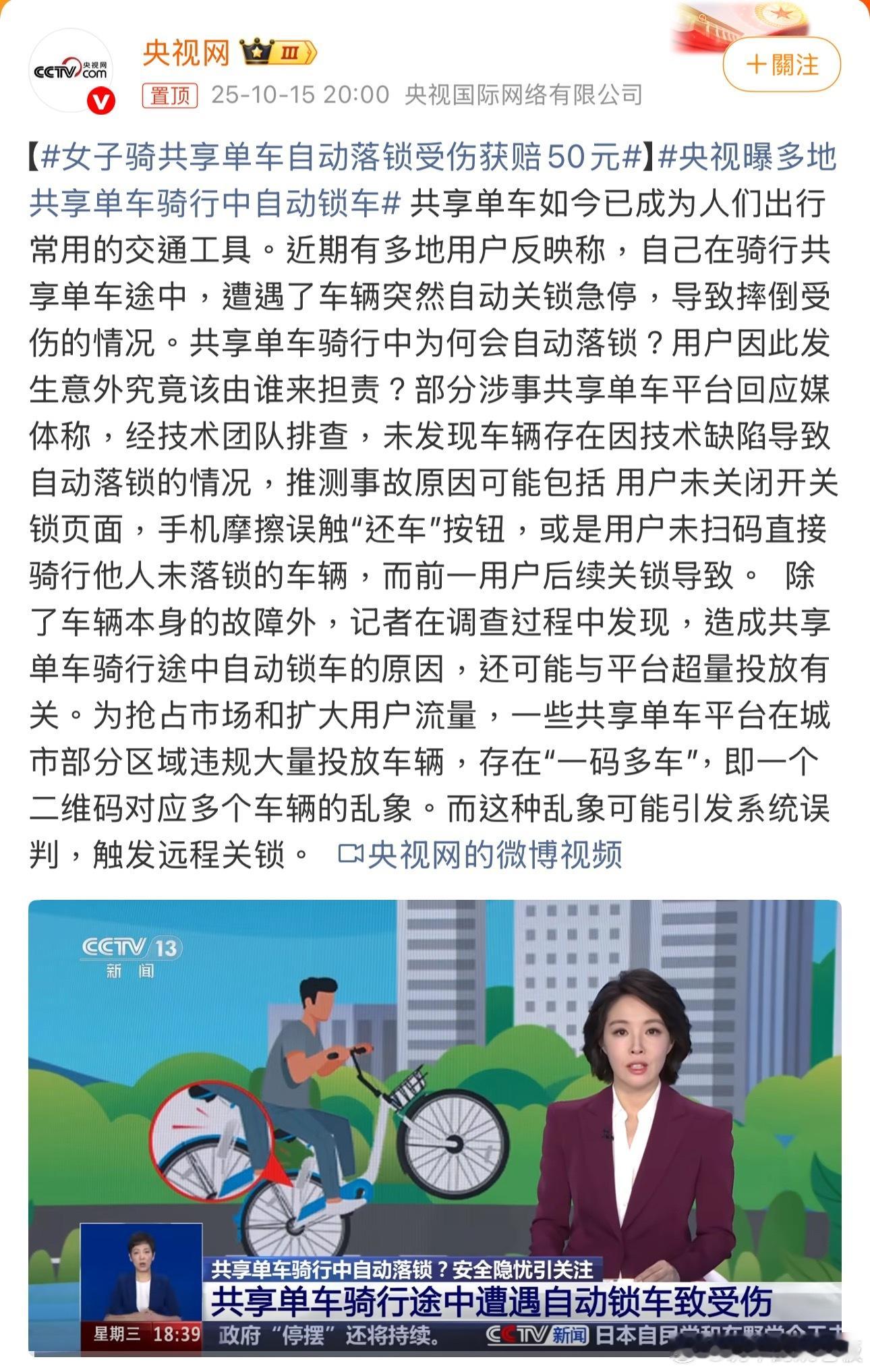央视曝多地共享单车骑行中自动锁车骑行中突然锁车太危险!尤其在车道、下坡时,易引发追尾侧翻。希望平台尽快排查漏洞,别让方便变隐患。大家骑车多留意车况,遇异常及时靠边,安全第一!