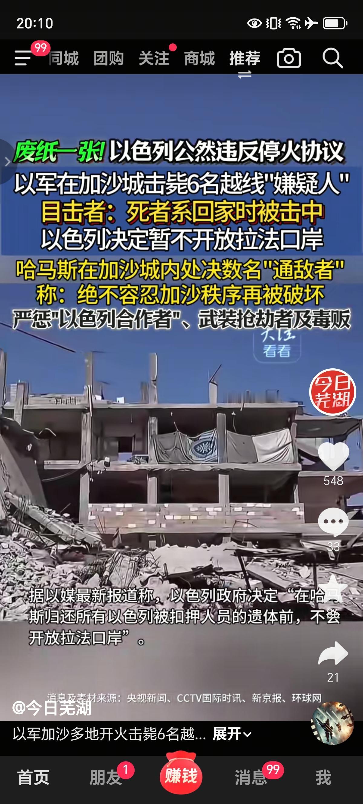 有人说停火协议是废纸一张,其实它起作用了的,以军已经根据协议停止战斗并部分撤出加沙地带,退守至新防线。 至于说停火协议既然生效了,那以色列还敢公然违反停火协议,在加沙城直接击毙6名越线“嫌疑人”,以色列给出理由了,不能开放拉法口岸,这6个人是嫌疑人,万一有别的不好的身份呢?能给出理由就代表协议有作用,要是不给理由才叫协议没作用呢,只能说协议没说越线的意思是具体从哪里到哪里算越线。 而且以色列也给出了拉法口岸暂时不开放的理由:根据加沙停火第一阶段协议,拉法口岸应在停火生效后72小时内,即10月15日开放,然而,以色列与哈马斯13日交换被扣押人员时,哈马斯虽释放了20名被扣押人员,移交了4具被扣押人员遗体,但仍有24具遗体未移交,以色列国防部长卡茨称哈马斯故意拖延移交遗体,将其视为违反停火协议,以方因此决定暂停重新开放拉法口岸,以此作为反制措施。 当然,哈马斯很难找到遗体了,指不定埋在地底或者海底了。协议嘛,弱者遵从,强者改写。