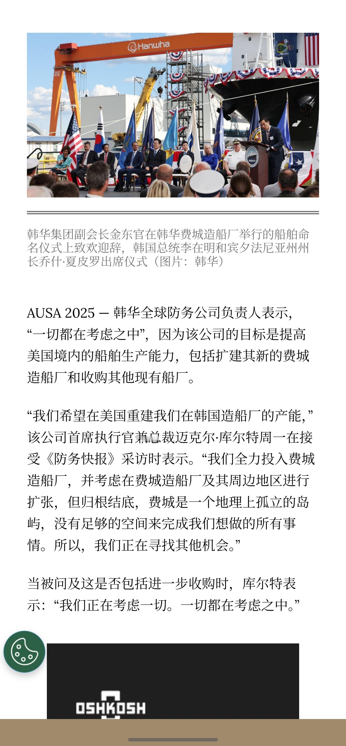 另一方面,韩华公司正在积极接洽其他美国造船企业,希望成为更大型项目的外包合作伙伴——这一概念在美国造船业和军方的说法中被称为“分布式造船(distributed shipbuilding)”。