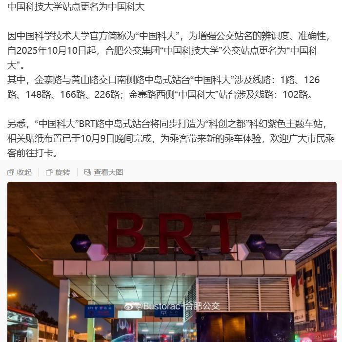 中国科学技术大学,简称为中国科大。自2025年10月10日起,合肥公交集团将“中国科技大学”公交站点更名为“中国科大"。改一下,的确高大上了。 看来很多人都说的中科大,说的不规范,要说中国科大才是代表这所一流的高校。