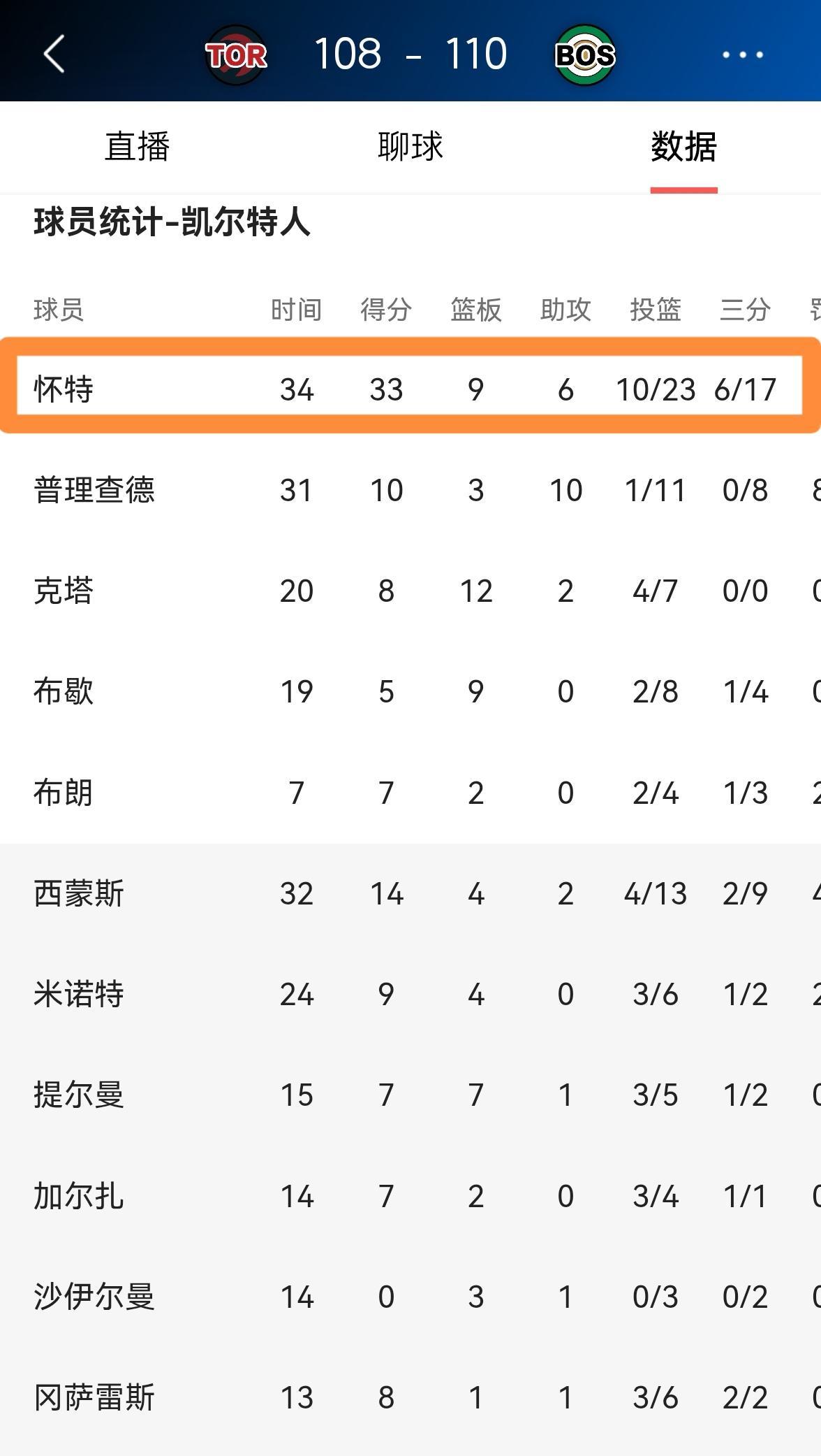 凯尔特人明星后卫怀特真是彻底的杀疯了!在今天凯尔特人主场以110:108险胜猛龙的季前赛中,怀特独挑大梁大杀四方。 全场比赛下来,怀特首发出战34分钟,投篮23中10,其中三分球17中6、罚球9中7爆砍33分9篮板6助攻4盖帽,他的场上正负值为+5,可是他的效率值高达+43。 毫不夸张的说,怀特绝对是凯尔特人能够赢下本场比赛的最大功臣,他在攻防两端都打出了超级巨星的表现。