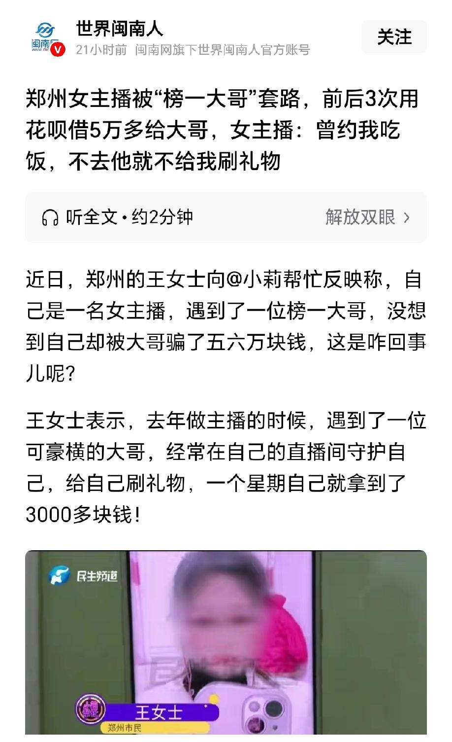 倒反天罡!河南郑州,女子在直播时,遇到一个豪横的“榜一大哥”,一直守在直播间给她刷礼物,一星期左右给她打赏3000元,她还以为遇到了好心人。没多久,男子主动邀请女主播见面吃饭,女子担心不见面就不给她刷礼物,于是应邀前往。没想到,男子竟然开口向她借钱,还明确说好还钱时间。女子不好拒绝,就用花呗借钱给男子,不成想竟接连给男子借钱5.6万元后,男子突然玩起了消失。女子本想做直播赚点钱补贴家用,结果钱没赚到,还倒贴了好几万。 2024年,王女士为了补贴家用,又没有合适的工作,她只能尝试做起了女主播。 刚入行半个月,她的直播间就迎来了一位重量级的观众,一位“榜一大哥”出手非常阔绰。 这位大哥每天准时守在她的直播间,各种礼物刷不停,短短一星期,王女士到手的打赏就有3000元。 对于刚起步的她来说,这无疑是个惊喜,心里暗自庆幸遇到了好心人,以为自己的直播事业终于有了起色。 相处到第20天左右,这位大哥突然说自己心情不好,要来郑州,还暗示如果王女士不出来见面,就再也不给她刷礼物了。 王女士纠结了很久,她舍不得这个金主,毕竟刚尝到一点甜头,实在不想轻易放弃,最终还是硬着头皮答应了见面。 两人一起吃了顿饭,聊得也算投机,关系也随之变得熟络起来,这让王女士对他多了几分信任。 大概半个月后,大哥主动联系王女士,说自己做投资担保生意,抵押了车辆后还差1万元资金,希望能向她借点钱,还信誓旦旦地约定了下个月还款的时间。 王女士一开始有些犹豫,她印象里大哥家境不错,怎么会差这1万元?可架不住对方言辞恳切,又想着借款周期短,风险应该不大,尽管自己手头不宽裕,还是凑了1万元借给他。 可到了约定的还款日期,大哥却以各种理由推脱,说过年还要做一笔生意,让王女士再借点钱给他,等生意盈利了就把之前的欠款一起还清。 王女士心里犯嘀咕,但想着已经借出去1万元,不继续借的话,之前的钱可能也拿不回来了,只能抱着侥幸心理,用花呗又给对方转了2.5万元。 让王女士没想到的是,这笔钱借出去后,大哥依然没有履约。 2025年2月,对方又以生意周转为由再次借钱,还进行道德绑架,声称如果王女士不借钱给他,他就赚不到钱,之前的欠款自然也没法还。 被债务套牢的王女士彻底没了办法,只能又转了2.1万元过去,三次借款加起来一共5.6万元。 可大哥拿到钱后没多久,就彻底失联了。王女士发信息石沉大海,打电话也无人接听,这才意识到自己被骗。 为了偿还借出去的钱和花呗账单,她每天要工作12个小时,即便如此,还有不少欠款没还清。 当初做主播这个行业本来是想赚点钱补贴家用,结果因为轻易相信别人,落到如今这个地步。 走投无路的她只能选择起诉,希望通过法律程序能追回这些借款,早点还清花呗欠款。 《民法典》第679条规定:自然人之间的借款合同,自贷款人提供借款时成立。 本案中,“榜一大哥”每次都明确提出借款需求并约定还款相关事宜,王女士虽通过花呗等方式凑钱,但均实际履行了款项交付义务,双方形成了事实上的借款合同关系。 该合同系双方真实意思表示,内容不违反法律、行政法规的强制性规定,合法有效。 因为借款事实清楚,法院最终判决对方偿还本金加利息共计6万多元。 但奇葩的是,王女士对这位“榜一大哥”的了解几乎为零,不知道他的真实姓名、具体工作,更不清楚他的家庭情况和住址。 判决书下来后,如同一个空头支票,她依然没能拿回一分钱,“榜一大哥”也像人间蒸发了一样。 《民法典》第40条规定:自然人下落不明满二年的,利害关系人可以向人民法院申请宣告该自然人为失踪人。 “榜一大哥”借款后失联的行为,使王女士陷入胜诉却无法回款的执行困境,从当前情况来看,王女士可通过两种法律途径进一步维权。 一是申请法院强制执行,借助网络查控系统查询对方名下银行卡、房产、车辆等财产信息,若发现可供执行的财产,可由法院依法拍卖处置以清偿债务。 二是在“榜一大哥”下落不明满二年后,向法院申请宣告其为失踪人,随后由财产代管人从其财产中支付所欠债务。 但本案中王女士对“榜一大哥”的身份信息一无所知,既无法提供准确的财产线索,也难以满足宣告失踪的主体信息要求,这也给维权增加了不少难度。 以前都是粉丝被女主播骗财的案例,如今王女士却被榜一大哥骗财,真的是有点太过奇葩。 王女士的经历提醒大家,网络世界鱼龙混杂,面对素未谋面的网友,哪怕对方表现得再大方、再可信,也千万别轻易借钱。