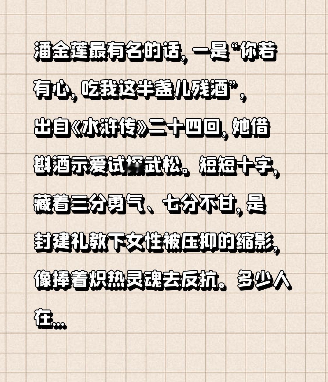 潘金莲最有名的话,一是“你若有心,吃我这半盏儿残酒”,出自《水浒传》二十四回,她借斟酒示爱试探武松。短短十字,藏着三分勇气、七分不甘,是封建礼教下女性被压抑的缩影,像捧着炽热灵魂去反抗。多少人在感情里也如此,用试探掩盖期待。 还有“大郎该吃药了”,也是《水浒传》经典台词。后来在《金瓶梅》里,她成了文艺女青年,写的四封情书才情满满,比如给西门庆的《寄生草》,把怨与爱都写进其中。