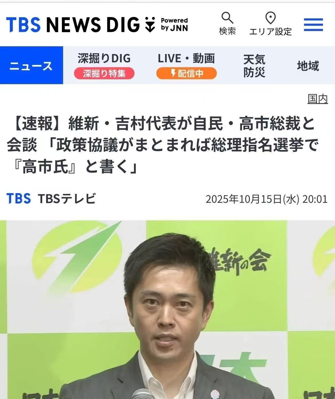一觉醒来高市首相又稳了 今天一早日本报道,维新会基本已确定和自民党结成联盟。