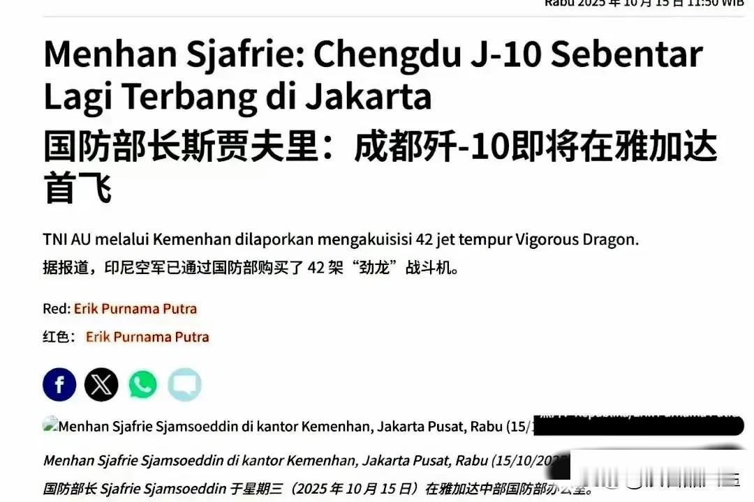 重磅消息啊!印尼真买了歼10!印尼国防部长直接说了,歼10马上就会飞过雅加达的天