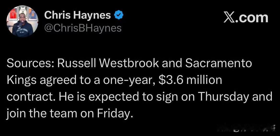 老将底薪!!!国王用一份底薪合同签下了威少! 上午我们也报道过,Shams透露经过漫长的休赛期交流及本身双方之间就互有好感,终于在新赛季开始前达成了签约协议,这真的是球迷们的一个好消息。 根据Haynes最新消息透露,威少和国王之间的合同是一份老将底薪合同,360万,尽管和掘金差不多,但是在这里威少能够获得更多的尊重和机会。 国王的管理层很喜欢威少,就像很多喜欢威少的球迷一样,他们需要赛场的活力和激情,指望着阿赞和拉文是没有什么活力的,国王现在的阵容还有调整的空间。 恭喜威少,加州很好,钱少活多离家近也是不错的,可以接受,哈哈!