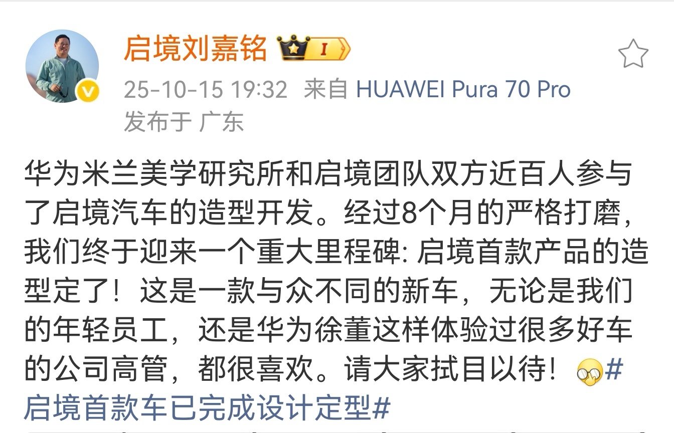 启境首款车已完成设计定型,这款车由华为深度参与——从外形设计阶段就介入了,覆盖营销等全环节,涉及产品打造的方方面面。[举手]