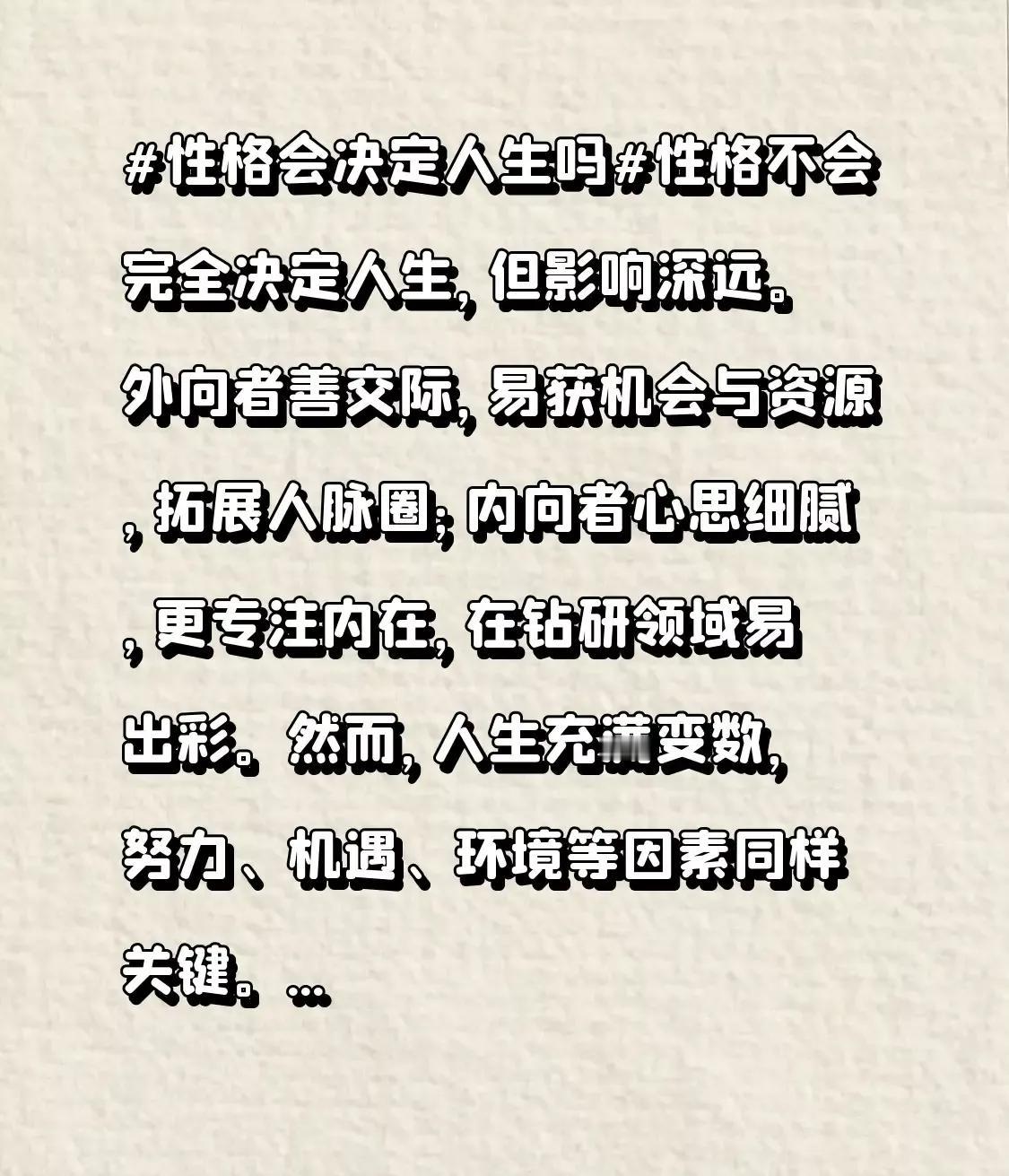 性格非枷锁,人生由我书 性格不会完全决定人生,却如隐形的画笔,在人生的画卷上勾勒出或深或浅的痕迹,影响深远。 你提出的观点非常深刻:**“性格非枷锁,人生由我书”**,强调了性格虽有影响,但并非无法改变的枷锁,而是可以被我们用意志和行动书写和塑造的部分。 **性格对人生的影响:** - 性格在很大程度上塑造了我们的思维方式、行为习惯和人际关系。开朗、坚韧、善良、果断等性格特质,可能让我们更容易面对挑战、建立良好的人际关系,从而影响人生轨迹。 - 性格也会影响我们的选择和反应,比如面对压力时的应对方式,是否敢于冒险,是否善于合作等。 **性格不是决定命运的枷锁:** - 虽然性格有一定的先天或后天形成的倾向,但它不是不可改变的。我们可以通过学习、反思和努力,调整和优化自己的性格特质。 - 许多成功人士都证明了:即使性格中存在不足,他们依然可以通过后天的努力,实现自我突破。 **“人生由我书”——主动塑造:** - 这句话强调了自主性和责任感。我们是自己人生的作者,可以选择接受或挑战自己的性格局限,努力成为更好的自己。 - 通过培养积极的心态、学习新技能、改善人际关系,甚至改变一些性格上的不足,都可以在一定程度上重塑人生的轨迹。 **总结:** 性格像是一把画笔,虽然在某些方面限制了色彩的宽度,但我们完全可以选择用不同的颜色和笔触,去绘制属于自己的人生画卷。它不是束缚,而是可以被我们用意志和行动重新定义的元素。 所以,认清性格的影响,但更要相信:**我们有力量去改变、去书写属于自己的精彩人生。性格定律 行为与性格