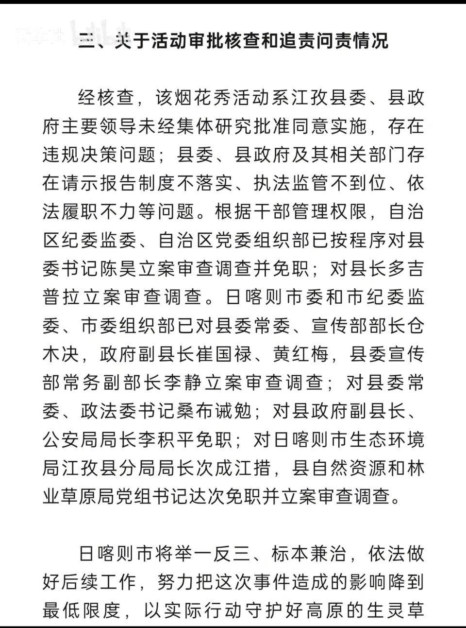 烟花结果出来了,县管理层一键清空。 县委书记免职 公安局局长免职 草原局党组书记免职 蔡国强和始祖鸟赔偿+生态修复,金额未明 县长都立案审查,大概率免职,现在没免是需要经过人大审批。