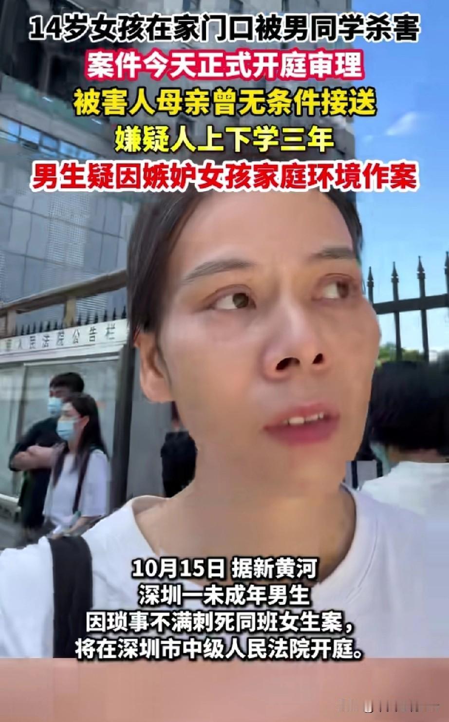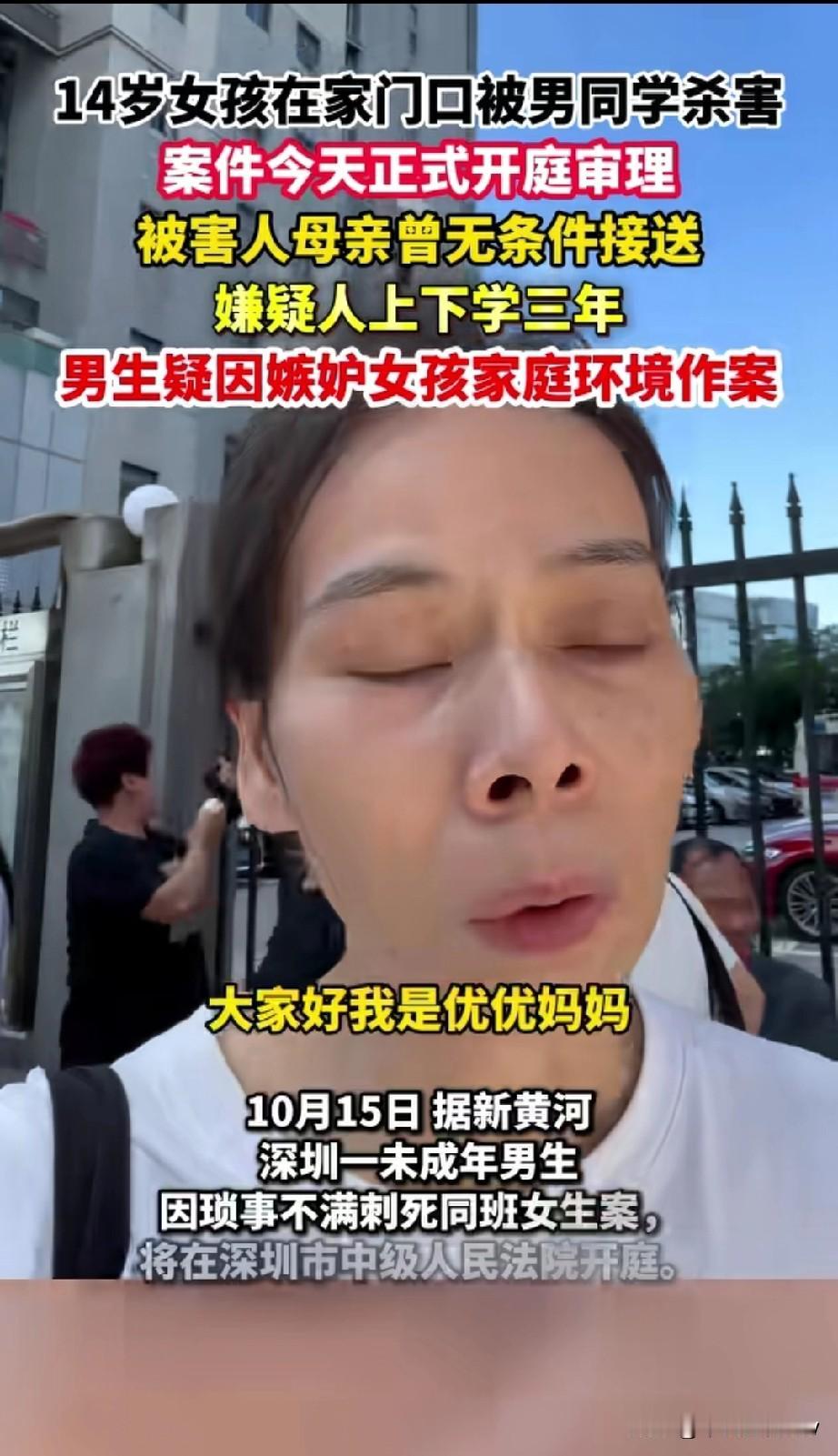 庭审结果,择期宣判!深圳13岁初中生优优半年前被同班男同学刺死案昨天开庭,突然刷到就是已经开庭了,才知道有这样的一件事,凶手真的是嫉妒心强,疑心重,恩将仇报!一开始刷到,我以为是哪种校园霸凌类的事件,没想到会如此离谱!凶手是优优妈曾经一直免费接送他三年上下学的学生! 优优妈介绍,凶手是跟她们住一个小区的,性格比较内向,但是平时上下学看见自己也都会叫阿姨好。自己平时去接女儿都会顺带接他一起,无条件的免费接送了三年,杀害女儿的动力是嫉妒女儿的学习比他好,家庭环境比他好,那优优妈说了,凶手的家庭环境比她们家好,认为优优条件优越看不起他。 自己也是有孩子的人,看到这种新闻很多时候我都不想打开看,但是又还是每次都看了,不看是我想逃避现实社会中会有这么离谱的事情,看是我有自己的孩子我得看看现实社会中会有如此残忍的事,我如何保护好自己的孩子,真的很矛盾,我喜欢世界上都是只有美好的事情,那是我最天真的想法啊! 因为如此琐碎不起眼的事情就能去要一个人的命,这种人是有多可怕,就算优优家里条件比你好,她平时比你优秀,你就能起杀心吗?一个人连这样一点心理承受力都没有,以后如何生存?见一个比你好的,就起杀心吗?现在的小孩,真的一点承受能力都没有,没有就算了啊,你随手就把人家给刺杀了,这得让别人的家庭多难受啊。 做案当时,被其他邻居看见了,喊他为什么动手,按照正常人的思维,被别人发现了就赶紧跑了,而他不一样,邻居喊他想制止他,他反而听见女孩在那喊叫后又折返回来继续补刀,直到受害者失血过多而休克死亡了。回家还谎称自己见义勇为而让自己双手受伤,这真的是怎样的孩子怎样的心态才能下如此狠手,看得我不寒而栗! 昨天此案开庭,庭审结果是择期宣判,看见优优妈这样,我真是太能理解她失去孩子的痛苦了,不知道结果如何,但是相信法律的公平公正的,没有一个人能逃过法律的制裁!