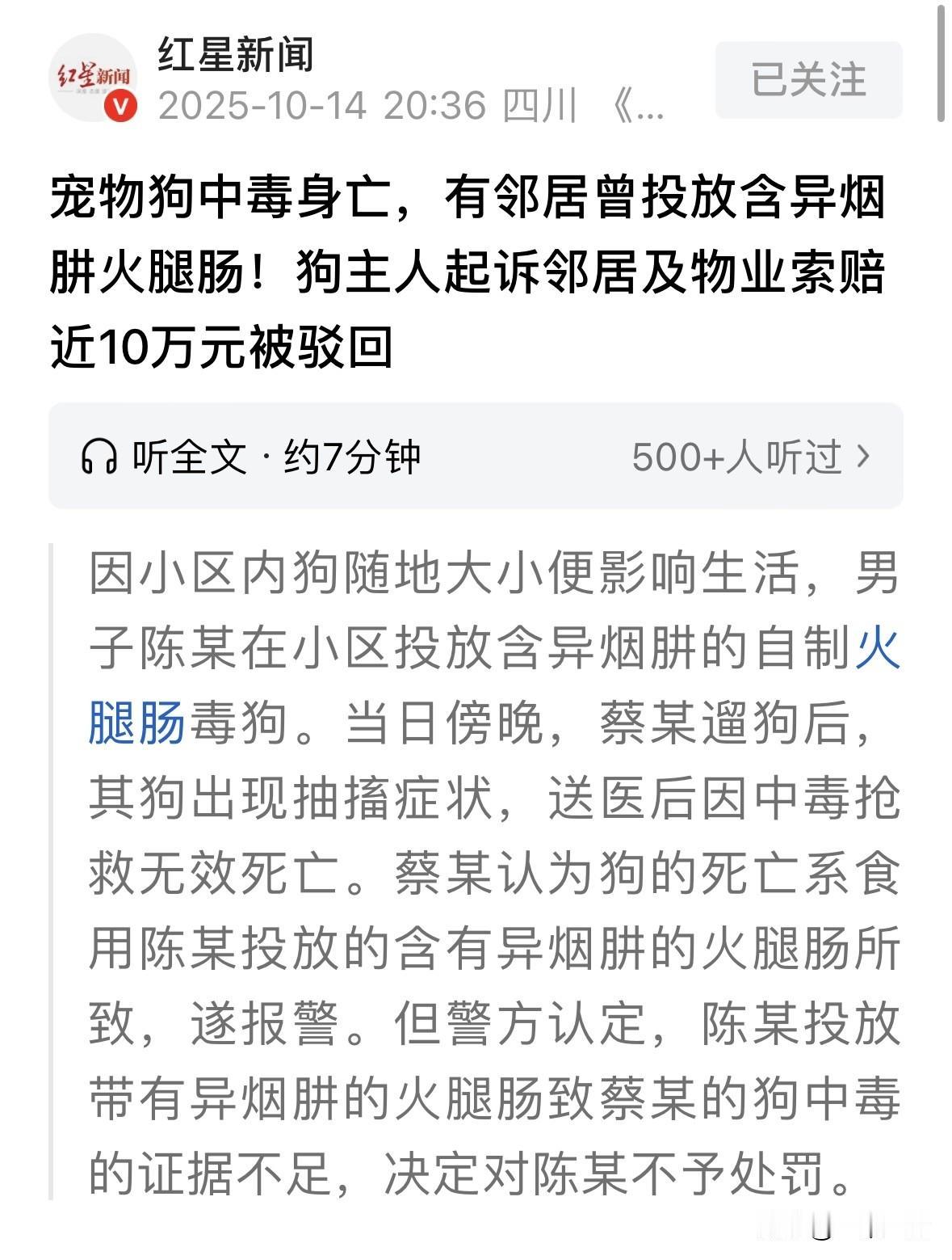 江苏南京,男子嫌小区里的狗总是随地乱尿,他难忍异味,就把带有含异烟肼的火腿肠投放在了小区里,没想到,一泰迪犬当晚中招,食用火腿肠后中毒死亡了,狗主痛失爱犬后悲伤不已,直接把投毒男子和物业告上法庭,索赔狗狗治疗费、火化费,以及精神损失费近10万,然而,法院判决让狗主傻眼。 2024年春天,蔡某迎来了十分灰暗的一段日子。 他养了十多年的泰迪犬“可乐”突然离世,这只从小陪着他散步、晒太阳的老伙伴,最终竟以中毒身亡这种让人揪心的方式离开了。 事情还得从隔壁92栋的陈某说起。 陈某家室外有个小院子,可这两年总被狗尿骚味熏得头疼。他多次找物业反映,可连廊里还是时不时能看见狗尿渍。 气头上的陈某直接在小区公告栏贴了张“警告书”,写着要往91到94栋连廊附近放掺了异烟肼的火腿肠,让养狗的统统长个记性。 3月8号那天,陈某真就动手做了六根“毒火腿肠”,用绳子捆扎实后,悄悄撒在了90栋和92栋北边的草坪上。 他想着,这样总能逼得那些不栓绳的狗主人收敛些。 没想到,当天傍晚蔡某遛狗时,他的宠物狗“可乐”第一个中了招。 蔡某平时遛狗都拴着绳,但没给狗戴嘴套。那天他像往常一样,带着可乐从66栋出发,绕到小区湖边跑道遛弯,最后从92栋附近转出来。 回家后不久,可乐就开始抽搐,吐白沫。蔡某连夜抱着狗跑宠物医院,最终检查结果为拟药物中毒。 虽然医院全力抢救,但可乐还是因为肝肾衰竭走了,光治疗费蔡某就花了4万6,加上火化费2千7,前前后后花了近5万。 3月11号,蔡某报了警。民警调监控、查现场,在草坪里找到了一根陈某投放的火腿肠。 可当问到陈某时,他却坚持说只是吓吓这帮狗主人。 后来公安调查后,认为陈某投放毒火腿致狗中毒证据不足,没给行政处罚。 蔡某不死心,2025年4月把陈某和物业公司一块告上了法庭,要求赔治疗费、火化费、狗的市场价,还有5万块精神损失费,共计近10万。 那么,从法律角度,怎么看待这件事? 《民法典》第1165条第1款规定:行为人因过错侵害他人民事权益造成损害的,应当承担侵权责任。依照法律规定推定行为人有过错,其不能证明自己没有过错的,应当承担侵权责任。 案子的核心争议在于陈某投放含异烟肼火腿肠的行为与蔡某宠物狗死亡是否存在法律意义上的因果关系。 蔡某作为原告需证明三点:陈某存在过错行为、该行为造成损害后果、过错与后果存在直接因果关系。 监控仅显示蔡某遛狗路线经过92栋北草坪,也就是陈某的投放点,但无法锁定狗实际接触毒物的具体位置。 蔡某自述狗曾进入草丛,但未栓绳、未戴嘴套,客观上增加了狗自行觅食的风险。 公安局明确认定“陈某投放行为致狗中毒证据不足”,形成行政程序中的权威认定,对民事诉讼中的举证责任分配产生直接影响。 蔡某遛狗路线覆盖湖边跑道、90-92栋区域,存在其他毒物接触可能,法院无法排除合理怀疑。 陈某虽然实施了投放行为,存在主观过错,但蔡某未能完成“因果关系”的举证义务。 根据“谁主张、谁举证”的民事诉讼规则,蔡某需对“狗因食用陈某投放的火腿肠中毒”这一核心事实承担证明责任。 在现有证据不足以形成完整证据链的情况下,法院依据过错责任原则,认定陈某行为与损害后果无必然联系,不构成侵权。 所以法院认为,虽然陈某确实投放了毒火腿,但蔡某遛狗时经过的区域多,没法证明可乐就是吃了这些火腿肠才中的毒。 监控只拍到狗在92栋北草坪附近活动,可那天蔡某遛狗路线长,谁也不能确定狗到底在哪儿吃的毒物。 再说物业公司,他们每天都有安保巡查和保洁服务,还经常在业主群里发文明养宠的提醒,联合社区搞过免费打疫苗、办犬证的活动。 出事之后,物业第一时间调监控配合警方,还在业主群反复强调“不能用投毒等违法方式处理矛盾”。 法院认为,物业已经尽到了合同义务,没有过错。 最后,法院只能判决驳回蔡某的诉讼请求。 有人认为,案件判决很有判例性的指导意义!从刑事司法上,狗子至多就是狗主的财产损害。它食异烟肼后死亡,只是民事纠纷案件。前提公安不能作为刑事(人中毒死亡)案件来立案,进而对死狗的直接原因进行法医鉴定。因此狗死于邻居的异烟肼投放也就缺乏证据了。 也有人认为,不文明养犬不对,但投毒人更不对,一旦有小孩误食了后果不敢想,变相杀人,心肠歹毒。 本案例,即使不能证明被告下毒毒死原告狗狗,但被告确实进行了投毒行为,如果有人故意把铁钉撒马路上,有人扎伤脚或车轮胎扎破,即使不能证明是他撒的铁钉扎伤,这人也有故意破坏罪,需要负刑事责任。 对于这件事,你怎么看? 欢迎关注@一案一论