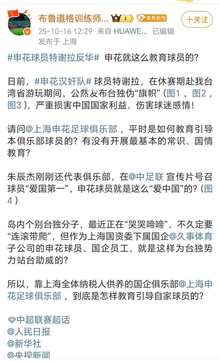 申花外援要搞事情?公开支持“台独”? 近日,上海申花外援若昂-特谢拉在社交媒体上发布了去台湾省旅游的照片,并在文案中配上了“青天白日旗”的图案。 这一举动引起了广大球迷的不满,在中超踢球,挂这种旗子,是何居心。不过随后可能有好心人提醒,特谢拉第一时间修改了社媒,删除了该图案。 到底特谢拉是无心之举?还是软件自动生成等,总之第一时间修改了,还是需要本人出来说明一下比较好。 中超