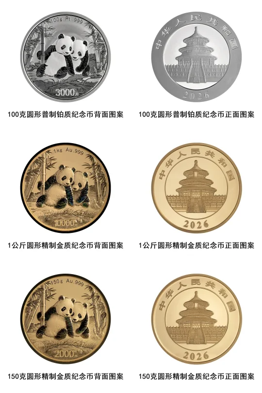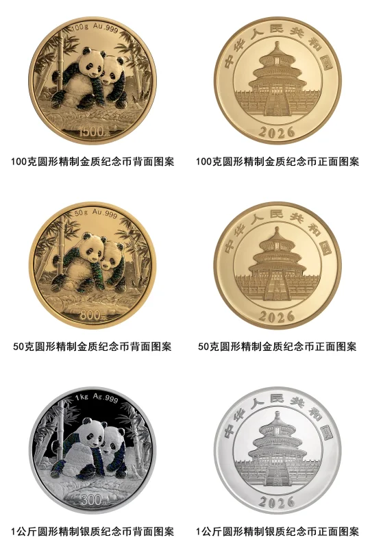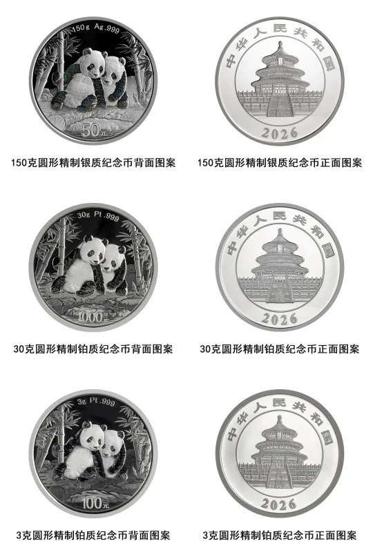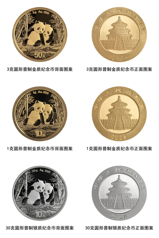 中国人民银行定于2025年10月31日发行2026版熊猫贵金属纪念币一套。该套贵金属纪念币共15枚,其中熊猫普制贵金属纪念币7枚、熊猫精制贵金属纪念币8枚,均为中华人民共和国法定货币。