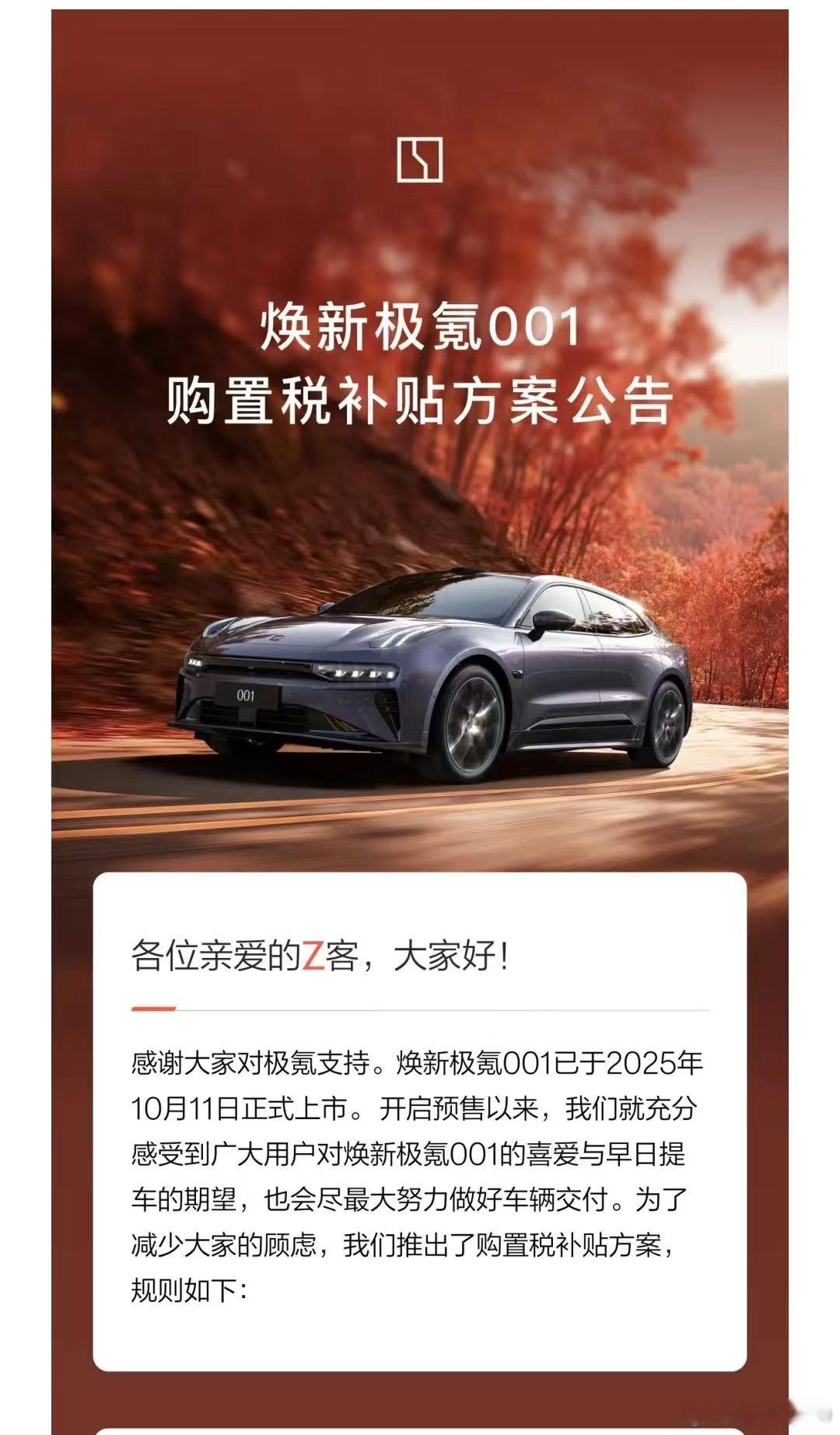 极氪001官宣购置税补贴方案