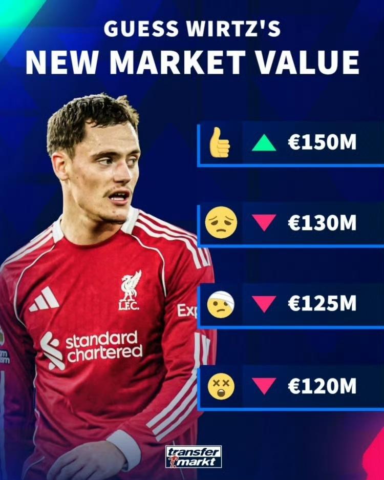 德转给的维尔茨身价,一步步下降中。 7月刚去利物浦1.5亿欧元。 8月就掉2000万也正常,等正式比赛。 9月新赛季开始了,1.25亿欧元。 10月份了,已经掉到1.2亿欧元。 拜仁球迷还是对他心心念念,明年维尔茨也就23岁8000万带回德甲!! 感谢利物浦替拜仁省钱,感谢英超替拜仁训练未来核心,拜仁就是想买。[大金牙]