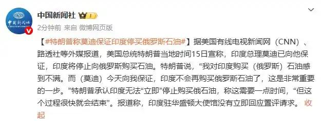 特朗普又赢麻了!莫迪向他保证不再购买俄罗斯石油。 国内媒体援引外媒报道称,特朗普15日宣称,印度总理莫迪已向他保证,印度将停止向俄罗斯购买石油。 美国对俄罗斯实行制裁以来,一直要中印两国都不要买俄罗斯的石油,但是中印两国两国都没有理睬。特别是印度,不但大量从俄罗斯进口低价石油,而且还转手倒卖给其他国家,从中大捞一笔。 特朗普对印度的做法非常不满,多次在公开场合要求印度配合美国,停止从俄进口石油。为了惩罚印度,还将印度的关税提高到50%。然而有很长一段时间,印度依然对此不加理睬。 但也就过了几个月,特朗普突然宣布印度已经答应了美国的条件,不再从俄进口石油。特朗普同时也说,印度彻底停止从俄进口石油,需要一段时间,不会马上就停止。 对特朗普来说,只要印度不买俄国的石油,相当于在很大程度上断了俄罗斯的财路,俄罗斯没钱了,俄乌战争就无再继续下去,那样的话他又能解决掉一场战争了,他离明年的诺贝尔和平奖又近了一步。 到目前为止印度方面还没有就这条消息发布评论。 果真如此的话,莫迪这人也太靠不住了吧。上个月在上合峰会上,他还和普京称兄道弟,怎么才一个月时间就又背刺普京了呢?