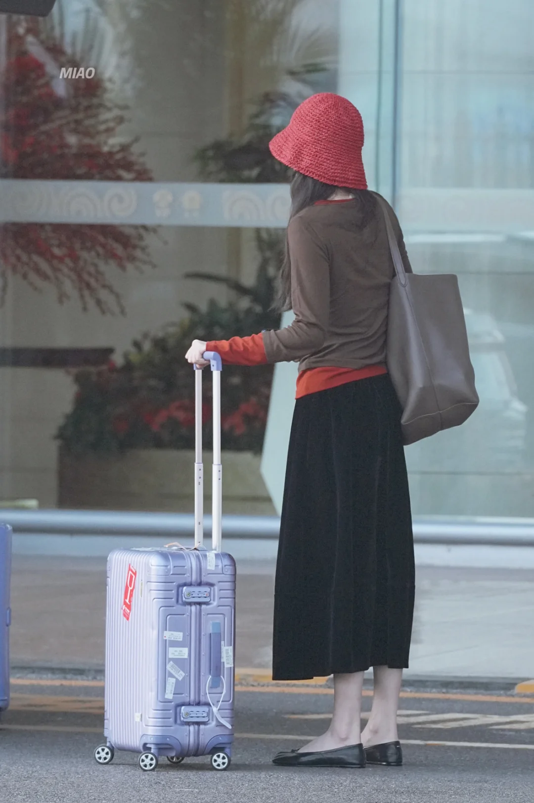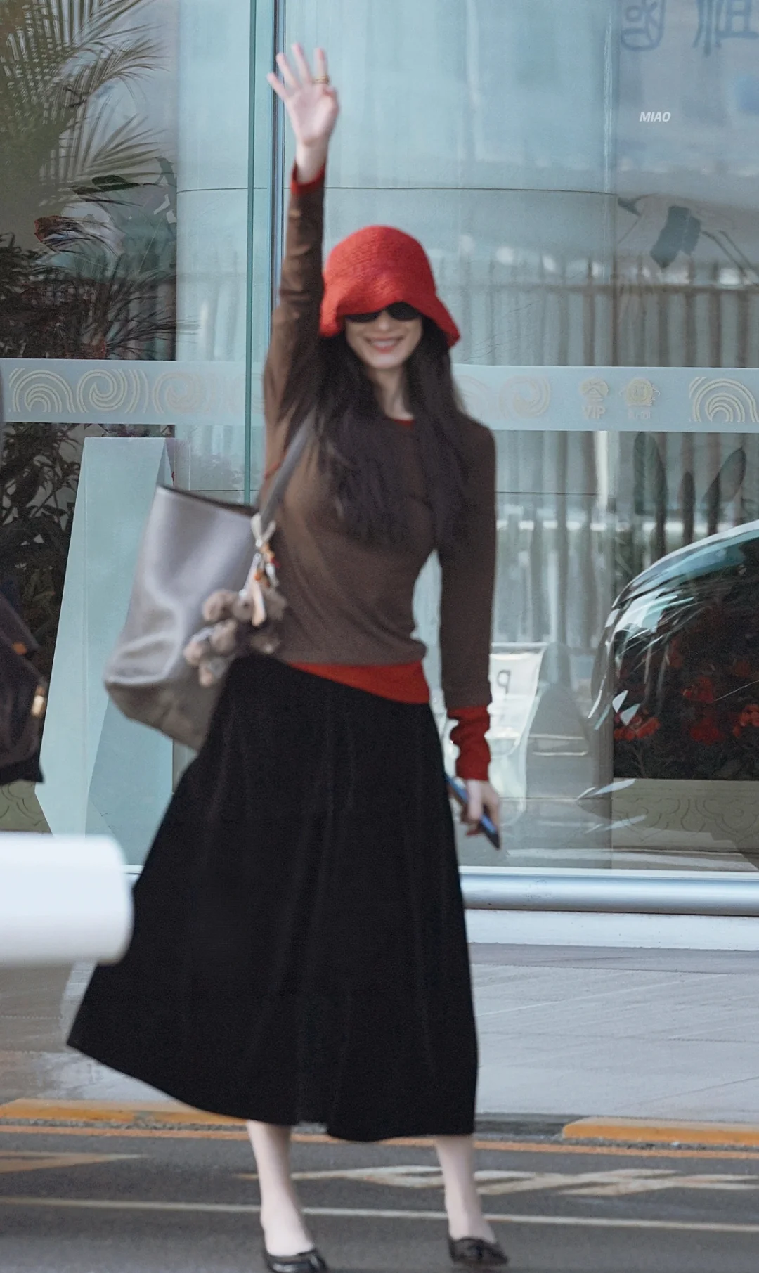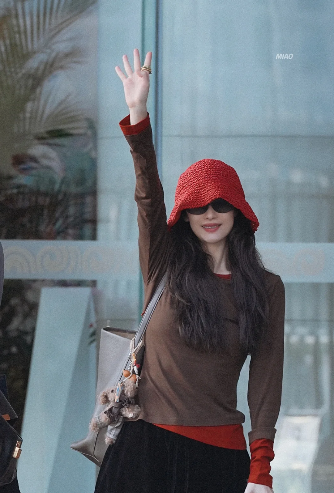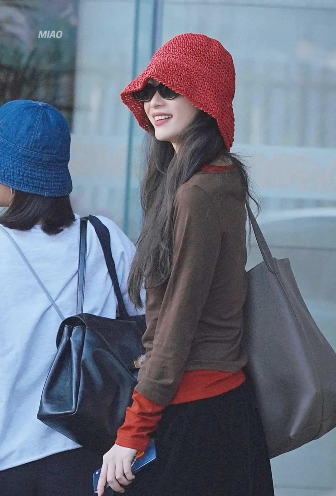 倪妮的日常私穿搭太有质感了!棕红叠穿的长袖上衣复古又温柔,搭配黑色丝绒半裙优雅大气,红草帽与小熊挂饰又添了几分俏皮,松弛随性的高级感谁不爱~