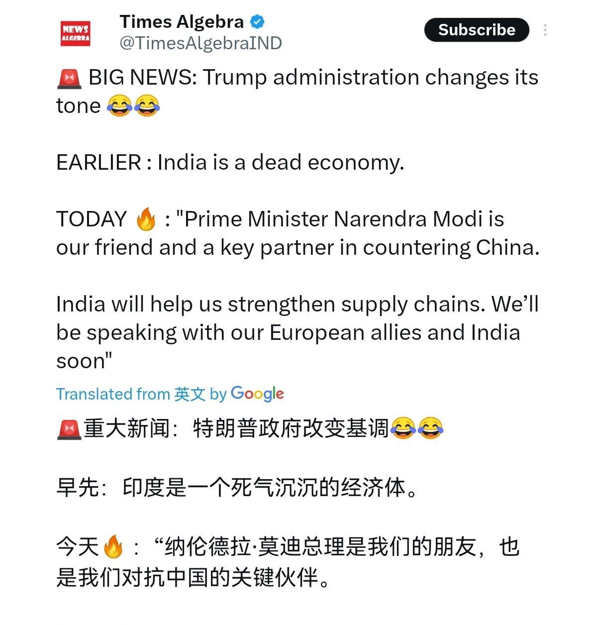 特朗普对印度的态度完全变了!在特朗普表示,印度经济已经死气沉沉之后,10月16日,特朗普声称,纳伦德拉·莫迪总理是我们的朋友,也是对抗中国的重要合作伙伴。印度将帮助我们加强供应链。我们很快将与我们的欧洲盟友和印度进行对话。 很显然,在特朗普本人宣称印度决定不买俄罗斯石油之后,特朗普又变了一副嘴脸开始拉拢与印度的关系,并意图通过拉近与印度的关系,对我们施加压力了。不过,说实话,在印度看来,昨天:印度经济陷入停滞。今天,印度是一个合作伙伴,特朗普的情绪波动简直比股票波动还快。 现在美国还对印度加税50%,八月份印度对美出口暴跌了14.35%,面对特朗普这样的说辞,印度敢信吗?印度能跟美国站在一起对付我们吗?很显然,特朗普是自以为很高明,自认为是制造了筹码。时不时的把我们挂在嘴边,这其实就更加说明,在我们面前美国一点便宜都没有讨到,心里面憋着无处发泄的怒气。吃了美国的大亏,印度估计是心有余悸,美印关系怕是难复往昔!