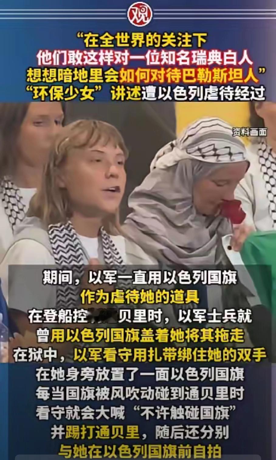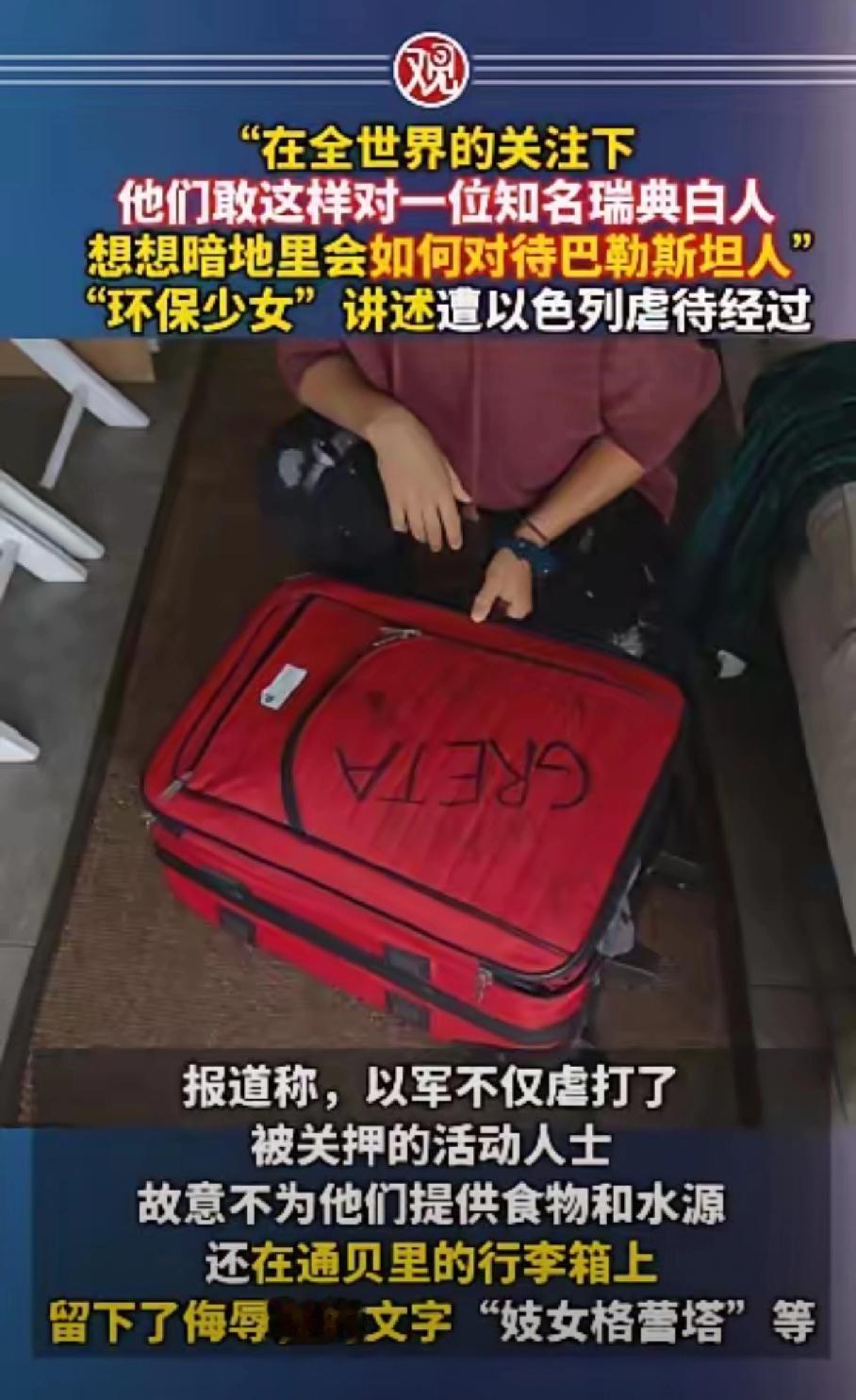 万万没想到,她这么刚!太飒了,不是吗? 刚刚看了瑞典媒体对“环保少女”的采访,感触颇多,本来想分享内容,可是吧,我这个号没V,内容可能发了你也看不到,我看观察者网也有类似内容,借过来一用。 实话说,它的报道也就外网内容的百分之五十。 我想说的是,对于通贝里,她的加沙行,真的不是做秀,别的不说,单就以色列给她的旅行箱上写的那些字,就足够让一个女孩子颜面尽失。 可是,她不但没丢掉箱子,也没有擦掉那些字,这需要极大的勇气。 她把它视为以军……毫无人性的证据,而非羞辱。 这小女子这么么刚,真的让人没想到。 尽管我发对以差评的短文,就会有人站出来跳脚,我还是要说一句,对待一个白人女性都如此,他们在加沙会怎样? 说到这里,哈马斯答应和解,但和平真的来了吗? 以色列没拿到加沙,内塔不会轻易收手,川普的斡旋,不过是一场表演。