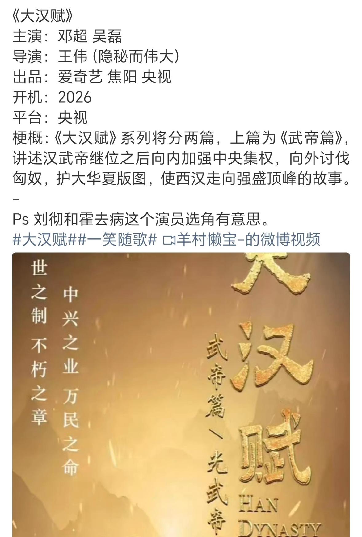 重磅历史剧《大汉赋》还没开机,就先踩了个“深坑”! 最近网上疯传,邓超要演汉武帝刘彻,吴磊接霍去病,阵容听着挺唬人吧? 可真相是,这俩人连合同都没签死!说白了,就是剧组放了个“烟雾弹”,先把热度炒起来再说。 更扎心的是,剧本到现在还没磨完,导演王伟又是出了名的慢工出细活,这一拖,直接拖到2026年才可能开机。 本来网友还挺期待:邓超演帝王,吴磊演少年将军,年龄差刚好契合历史,怎么看都是王炸组合。 可偏偏半路杀出个“档期危机”——吴磊明年得先拍《剑来》,万一《大汉赋》延期,俩顶流撞了档期,剧组怕是要傻眼。到时候别说君臣联手了,能不能凑齐人都是问题! 最让人捏把汗的是,历史正剧最容易“烂尾”。像之前《曹操》《张居正》,筹备时吹得天花乱坠,最后不是剧本卡审就是资金断档,悄无声息就黄了。 如今《大汉赋》也像是走钢丝:一边要保住央视的“正剧招牌”,一边又得讨好年轻观众,选角稍微偏一点,可能就砸了四百年汉朝史诗的厚重感。 不过话说回来,好饭不怕晚。 邓超要是真能收住喜剧人设,正经演一回雄才大略的刘彻,吴磊也能靠霍去病再刷一波硬汉口碑,这剧说不定真能成经典。 但前提是,剧组得先解决“画饼”问题,别光顾着炒话题,赶紧把剧本、档期落实了才是正道! 影视圈画饼充饥的套路,观众早看腻了。与其急着用明星阵容吊胃口,不如学学《觉醒年代》的诚意——好故事+硬演技,才是爆款真正的底气。