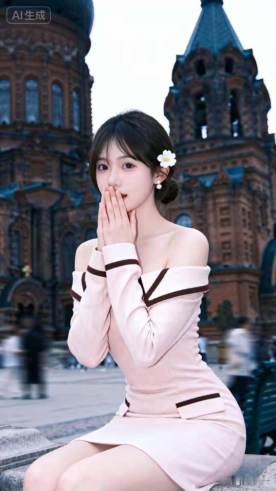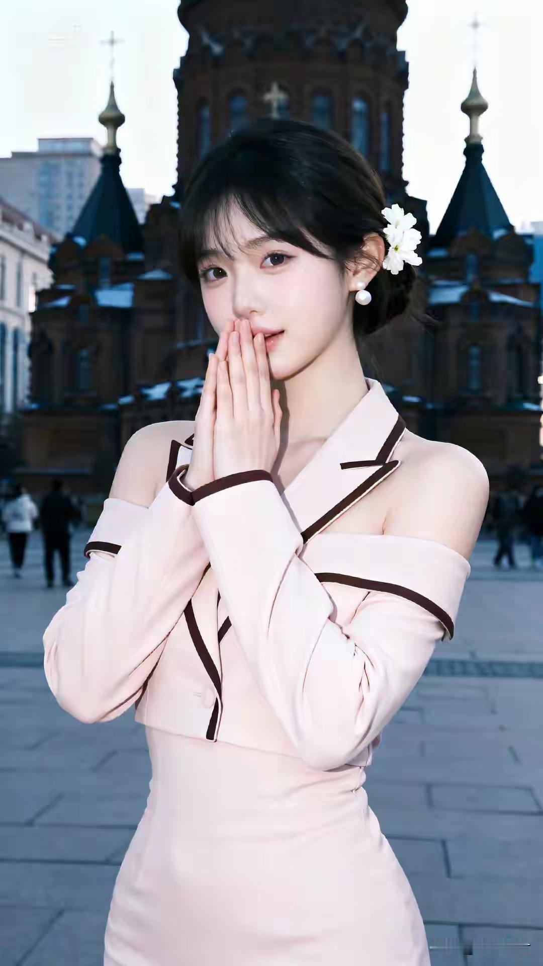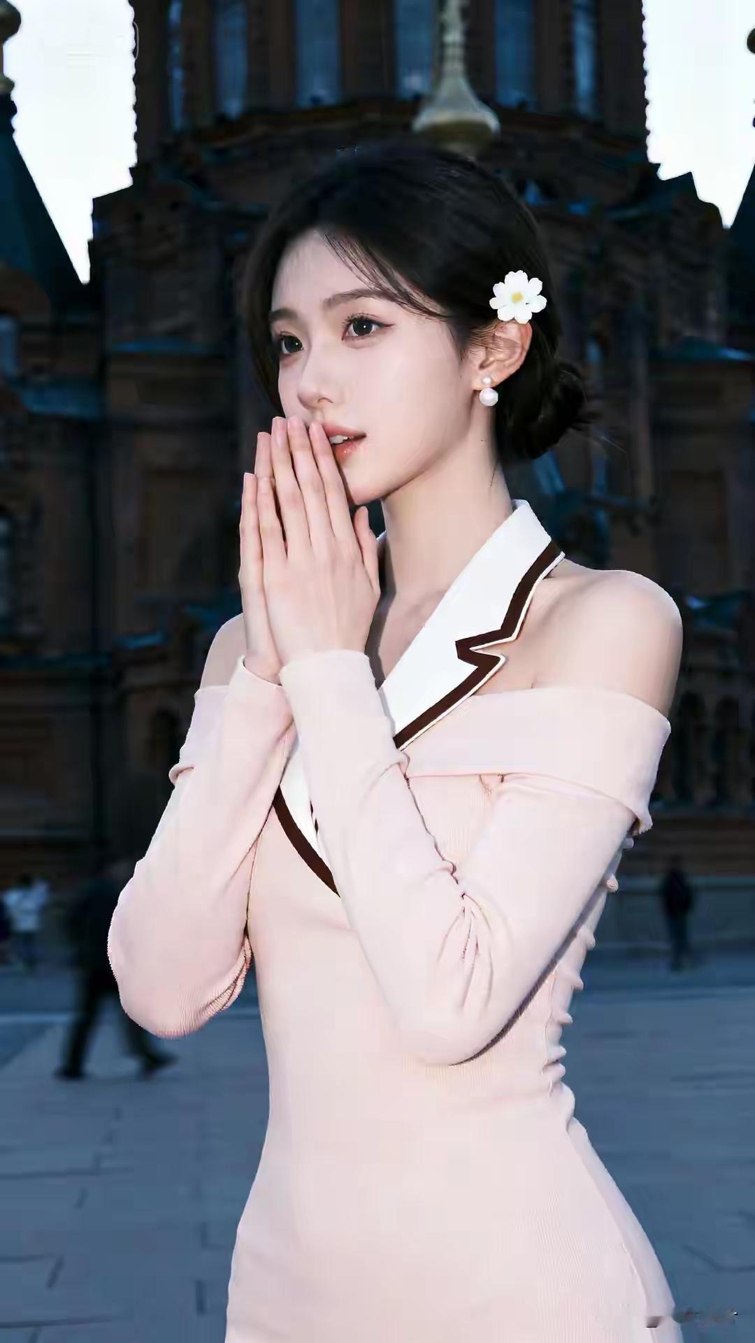 建筑前的优雅小香风 裸粉色露肩裙,棕边点缀精致又高级,发间白花、耳间珍珠,把优雅感拉满~在复古建筑前,双手轻合,仿佛把时光里的温柔都定格在了这一刻✨