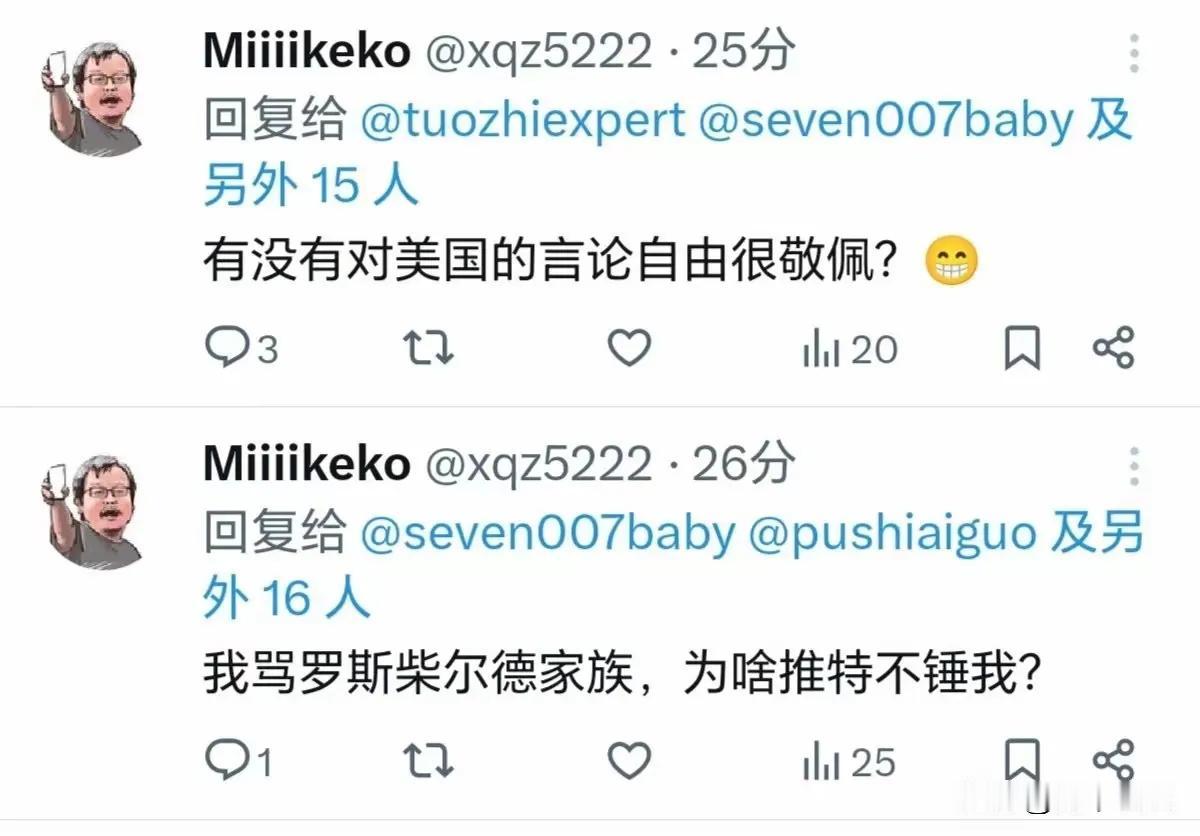 【吹捧美国“言论自由”的大殖子,终究被推特“教做人”】 有个网名Miiiikeko的大殖子,在推特大吹特吹美国的“言论自由”,结果就因为骂了句查理柯克,又冲着犹太财团一顿嘴炮后,账号直接被冻结,来了波“秒打脸”。[捂脸][捂脸][捂脸] 怎么样,够自由吧。这下记住了哈,美国的“自由”从来是分人的——符合他们利益的叫自由,敢碰他们禁忌的,分分钟让你“消失”。别忘了“政治正确”这个词就是从他们这儿来的。 美国的言论自由,本质是资本和霸权的自由,从来都轮得到他这种小喽啰指手画脚?资本主义的铁拳不是开玩笑的。[呲牙] 殖人公知 西式舆论自由 美国舆论