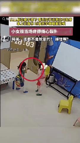 万万没想到!上海,上一秒两个人还在一起玩滑滑梯,下一秒回到教室后,高个子同学捡起地上的花露水,转身就往小女生的脸上喷,当场疼得撕心裂肺的吼叫。网友:她清楚地知道自己在做什么? 视频中,高个子女同学捡起了地上的花露水,转身后毫不犹豫的把它喷向了小女生的脸上,小女生当场哭疼得撕心裂肺。高个子女同学看到小女生跑了出去,先不慌不忙的把花露水放在了架子上,转头就钻到了桌子底下躲了起来。 据小女生的妈妈讲,她们明明上课还一起玩的滑滑梯,只是回教室拿自己的衣服,就发生了这样的事情。孩子的眼睛痛了1个小时,回家都不肯让我碰眼睛。 细心的网友会发现,她一进教室就奔着花露水去了,不知道是太紧张了还是什么原因,拿起的瞬间,花露水就掉地上了,而她随即又把它捡起来,还测试了一下看喷口的朝向。转身后毫不犹豫的对着女孩的脸喷去。 而小女孩家属也是选择了报警,但派出所说孩子太小,没办法追责,无法立案,只能双方家长协商处理,高个子同学的父母也是道歉了,并答应出医药费。 有网友说,这女孩非常的有耐心,并且是有计划的在做坏事,怕花露水喷不出来,还特意在手上测试了几下,确保成功。 确实是这样的,从视频中就能看到,高个子女孩一进教室就奔着花露水去的,还测试了几下,在确认无误后,转身就向小女孩喷了过去。 还有一个网友说,他儿子不小心把花露水喷到了姐姐的眼里,后来他又捣鼓喷到了自己的眼睛,然后再也不敢喷了。 俗话说得好“勿以恶小而为之”。不管她是有计划的还是无心的,学校也该借此加强安全教育,比如讲解危险物品的使用规范,而家长对于犯错的孩子,不能简单以“年纪小”为由放任,家长需要对她严肃教育。 对于这件事,你有什么样的看法?在评论里留言讨论。