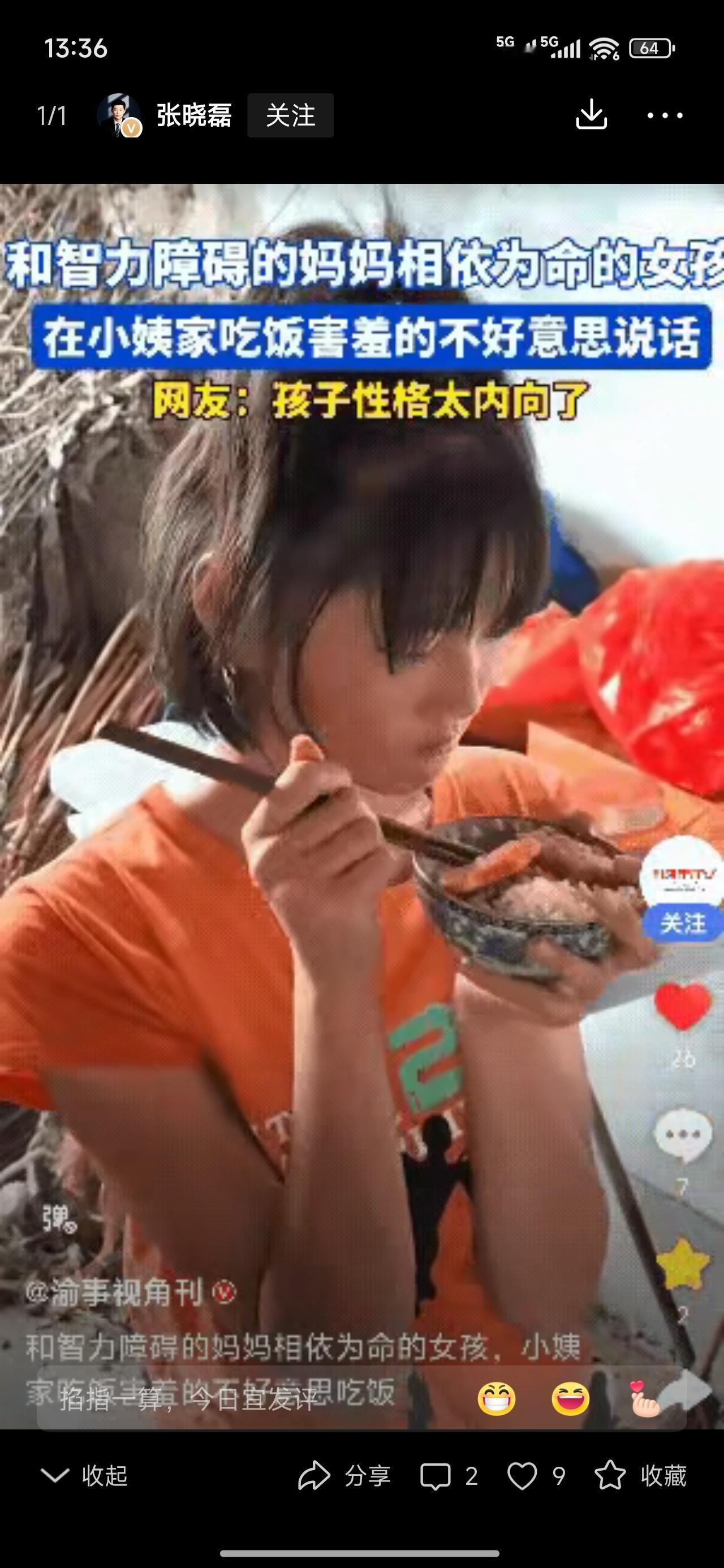 这画面,真是让人心疼到骨子里!一个小女孩端着碗,低着头,不敢多说一句话,仿佛整个世界都在压着她的脊背。她的眼神里藏着太多的无助与孤独,却又那么懂事,努力用微笑掩饰内心的脆弱。这一幕,刺痛了无数网友的心,也让我们不得不反思:在这个快节奏、功利的社会里,有多少像她一样的孩子,默默承受着家庭的重担,却无人知晓。 她的妈妈,是智障,不能给予她完整的呵护和关爱。或许在别人眼中,这个家庭的故事平凡而普通,但在她的世界里,却是无尽的苦涩和孤独。她从小就学会了坚强,用微笑面对生活的苦难,用懂事来弥补缺失的爱。这种坚韧,让人敬佩,也让人心碎。我们常说,孩子应该是天真无邪的,是家庭的希望和未来,但现实中,有多少孩子在无声中承担着成人的责任?他们的童年,是否早已被现实碾碎得支离破碎? 网友们纷纷留言:“明明那么缺爱,却懂事得让人心疼。”的确,这样的孩子,是这个社会最需要被关注的角落。我们常常把目光投向那些光鲜亮丽的明星、成功人士,却忽略了身边那些无声的“弱者”。他们或许没有显赫的背景,没有耀眼的光环,但他们的坚韧、善良、纯粹,才是真正值得我们尊重和学习的品质。 这幅画面,也让我们反思:我们是否真的给予了孩子们足够的爱与关怀?我们是否在繁忙的生活中,忘记了那份最初的温暖?每一个孩子都值得拥有一个温暖的家庭,一个可以依靠的港湾。不是每个家庭都能完美无瑕,但只要我们多一点耐心、多一点关爱,就能为他们撑起一片天。 或许,这个社会需要的不仅仅是物质的富足,更是心灵的关怀。让我们从自己做起,关注那些被忽略的角落,用我们的行动去温暖那些需要帮助的孩子。因为,只有当我们每个人都愿意伸出援手,这个世界才会变得更加美好。 你我或许无法改变所有的命运,但可以用一份善意,点亮一份希望。希望那个小女孩,能在未来的日子里,感受到更多的温暖和爱,重新拾起童年的纯真与快乐。让我们一起为她,也为所有像她一样的孩子,点亮那一束希望的光。