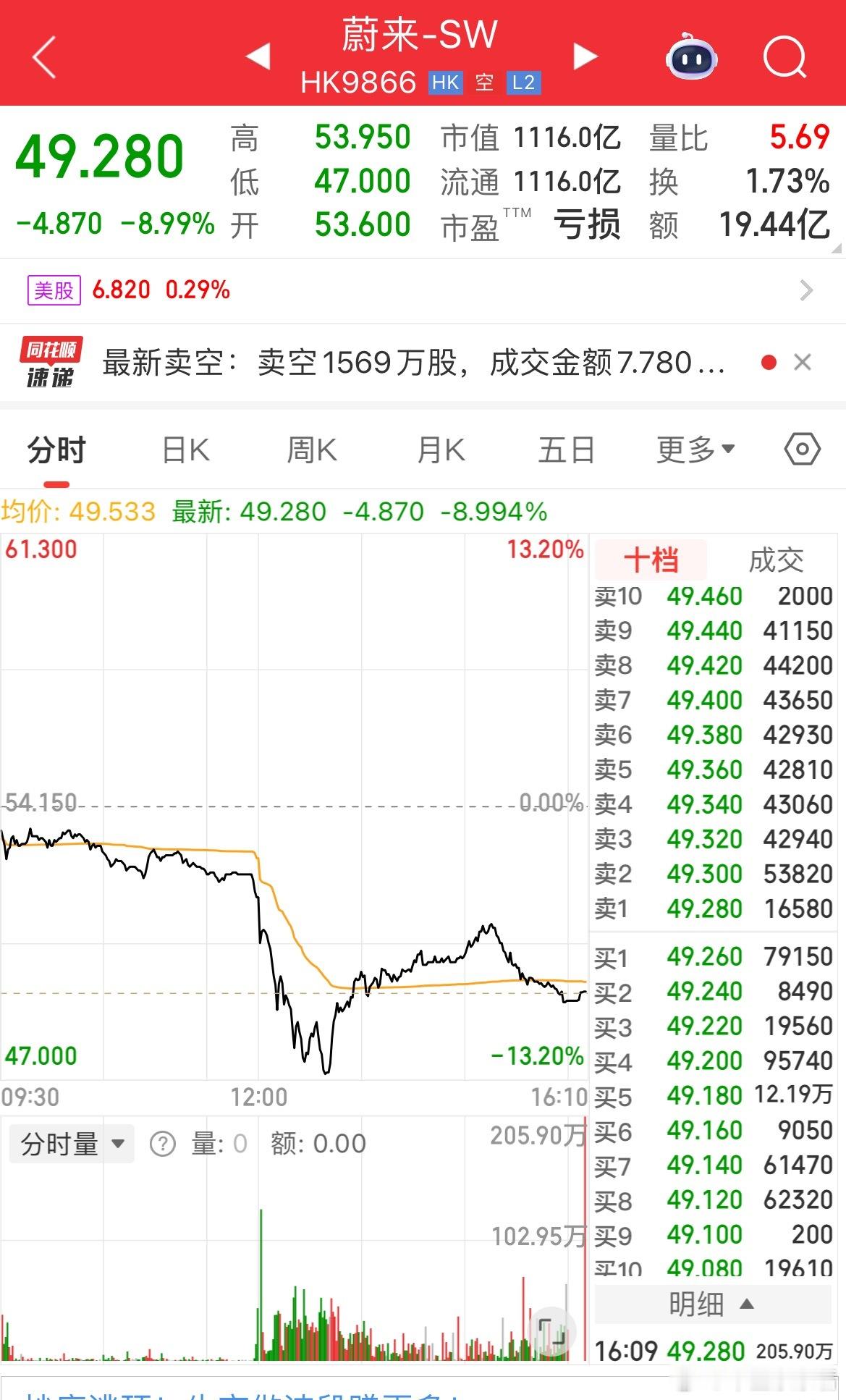受此消息影响,蔚来港股大跌。截至当日收盘,蔚来跌8.99%,报49.28港元。