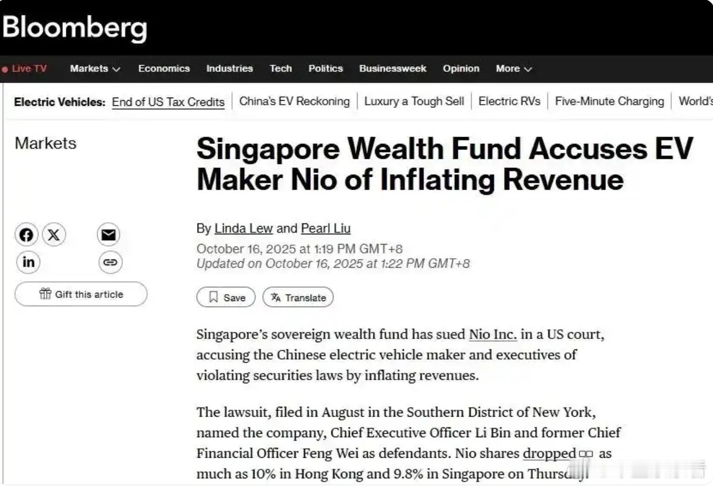 股价大跌,蔚来被新加坡主权财富基金起诉?