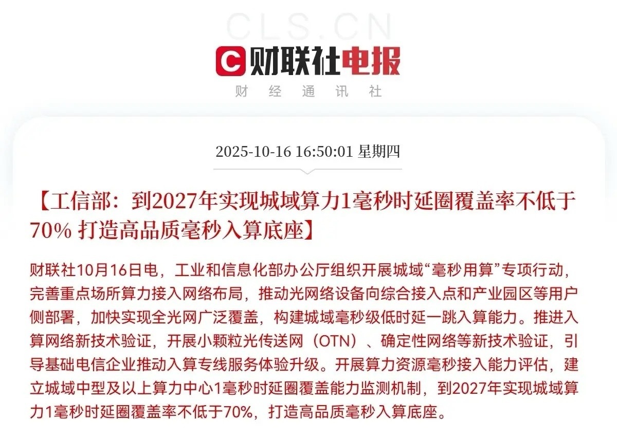 下午工信部突发发重磅消息,将开展城域“毫秒用算”专项行动,在城域内提供毫秒级算力资源网络通达能力,到2027年实现城域算力1毫秒时延圈覆盖率不低于70%,打造高品质毫秒入算底座,这个专项行动对于算力板块是重大利好消息,该专项行动旨在通过构建低时延、广覆盖的城域网络,推动算力资源高效利用,是落实国家“算力基础设施高质量发展”战略的重要举措,将显著增强我国数字基础设施竞争力,算力即国力,相关算力公司将会迎来重大发展机遇,值得期待