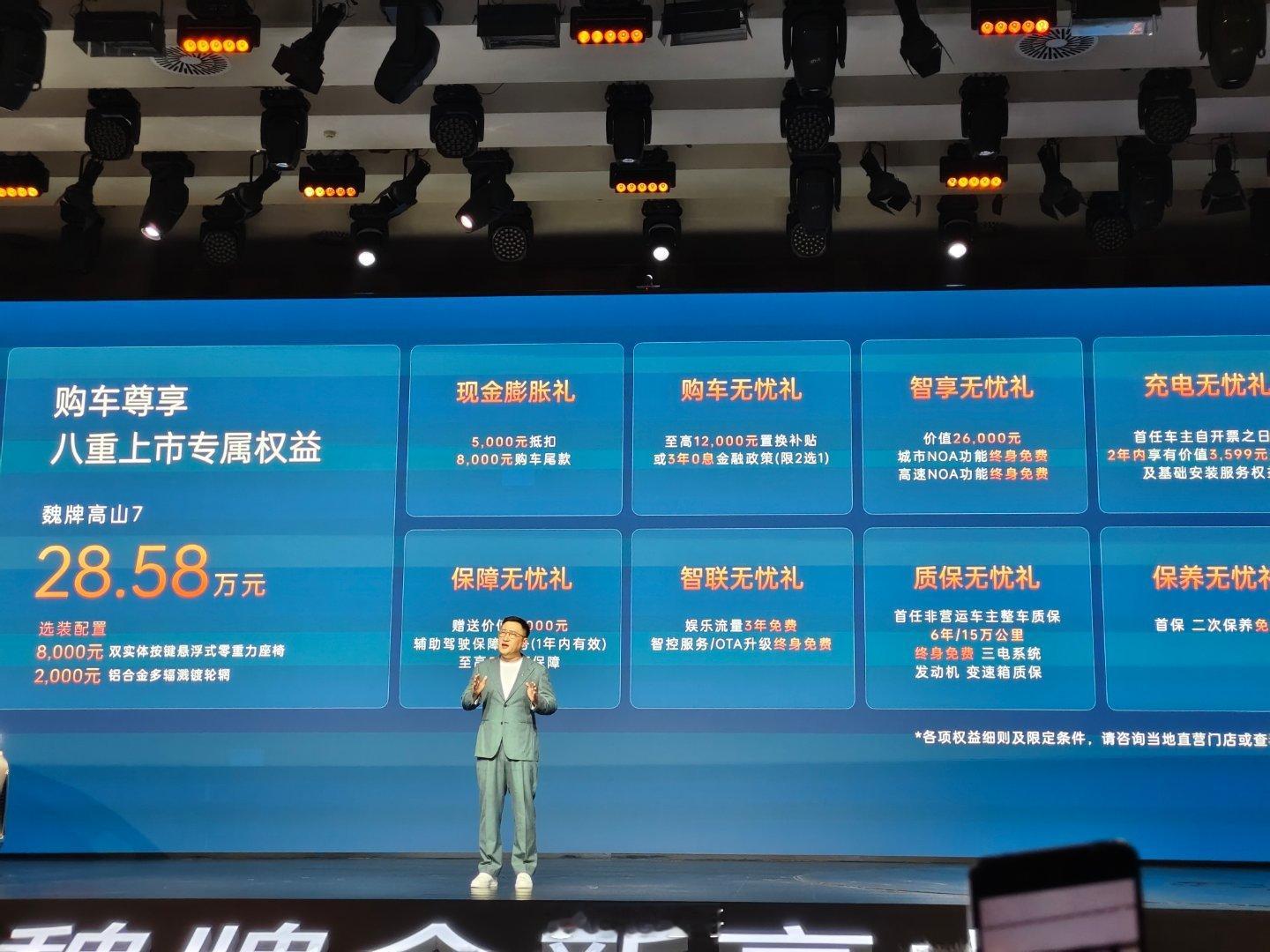 28.58万,魏牌高山7的正式上市价格来了!这个价格你可以享受到和高山8同样的,1.5T加4挡DHT的Hi4性能版,端到端智驾,冰箱彩电大沙发等等。