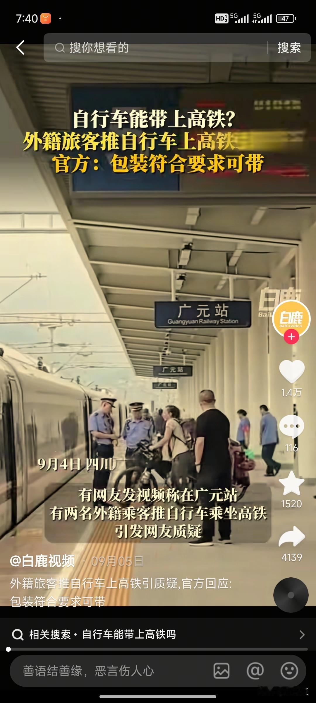 对此了一下,我感觉受到了不公平的待遇! 近日中安在线报道,一位旅客,将自行车用硬纸壳包装,且自行车明显看出来已经折叠,准备带上火车,被车站拒绝理由是超长了!(下图1),联想前些时候,几位外国人,推着自行车上火车,没折叠,没包装,大摇大摆的在车站工作人员的指挥下登车!(下图2) 政策的制定,应该一视同仁,不应因为人种的不同或者国籍的不同而区别对待! 最后一句,在自己的国家,自己的土地上更应该挺直腰杆,不能低人一等!