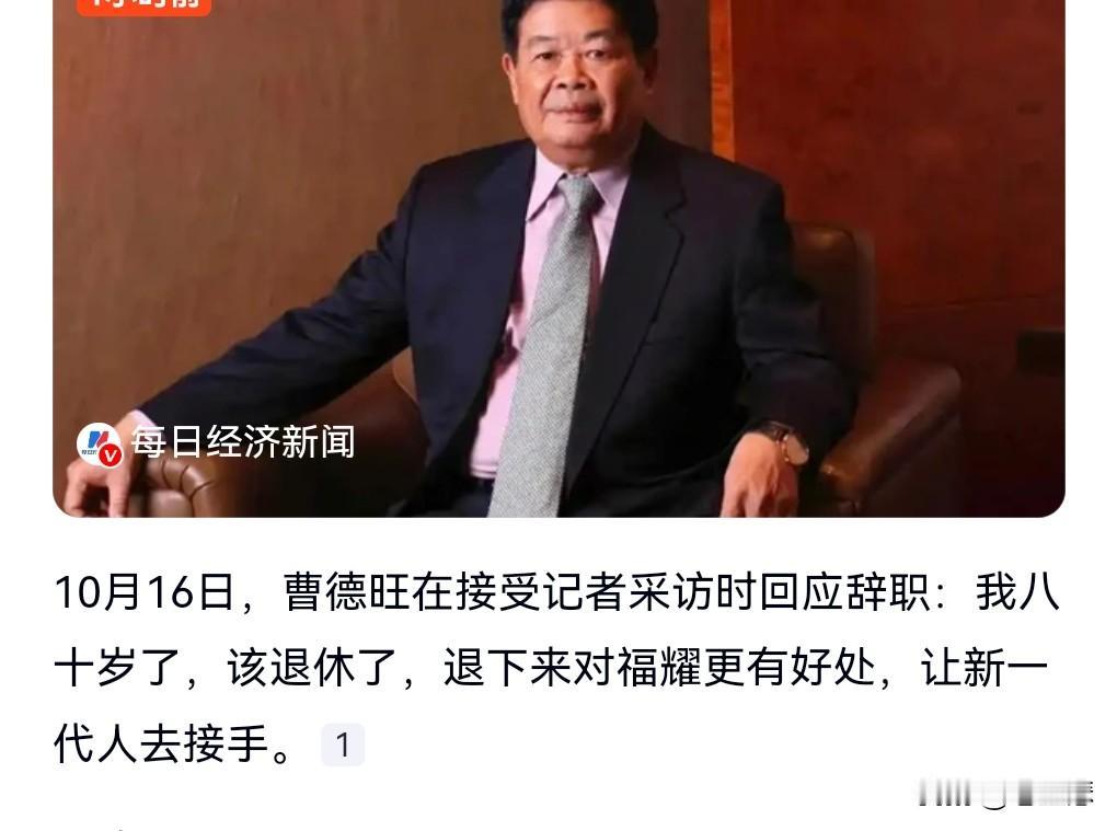曹德旺辞职了。 10月16日,对此他也是进行回应。他说自己80岁了也该退了。 想不到他已经80岁了,那确实该退休好好享受闲暇的养老生活了,工作并不是人生的全部,他早已功成名,现在最重要的就是安享晚年。 这退休的还是太晚了,像他70岁退下来都可以。 干嘛操这么大的心,早该交给儿子了。